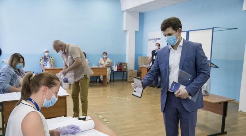 При входе заместитель губернатора, как и все голосующие, прошёл все необходимые процедуры: прошел температурный контроль, обработал руки антисептиком, а затем ему выдали набор: одноразовые защитную маску, перчатки и ручку.