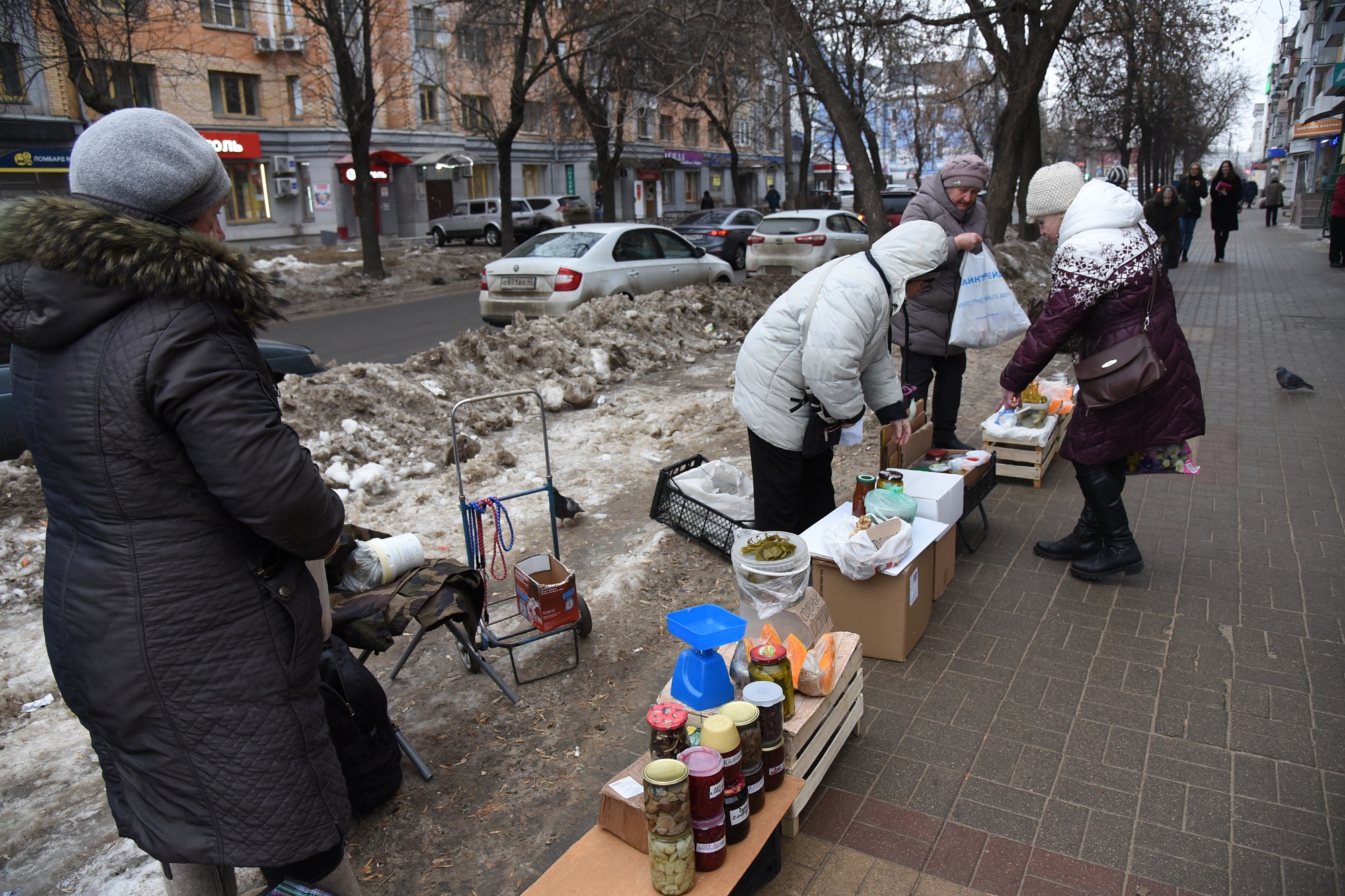 С недавнего времени на улице Плеханова образовался стихийный рынок. Стоят калужане со своим незамысловатым товаром и предлагают прохожим баночку огурцов, варенья, приправы, корни хрена, чеснок, картошку, яблоки.