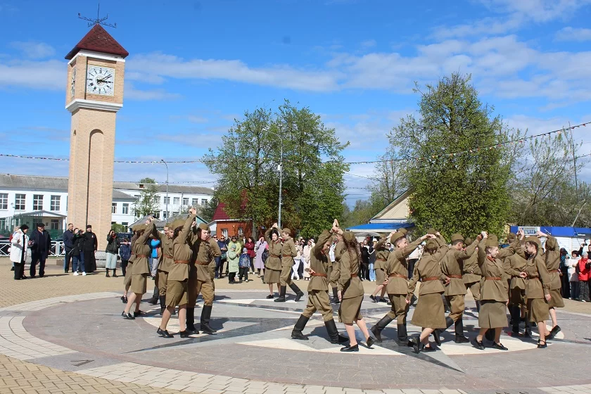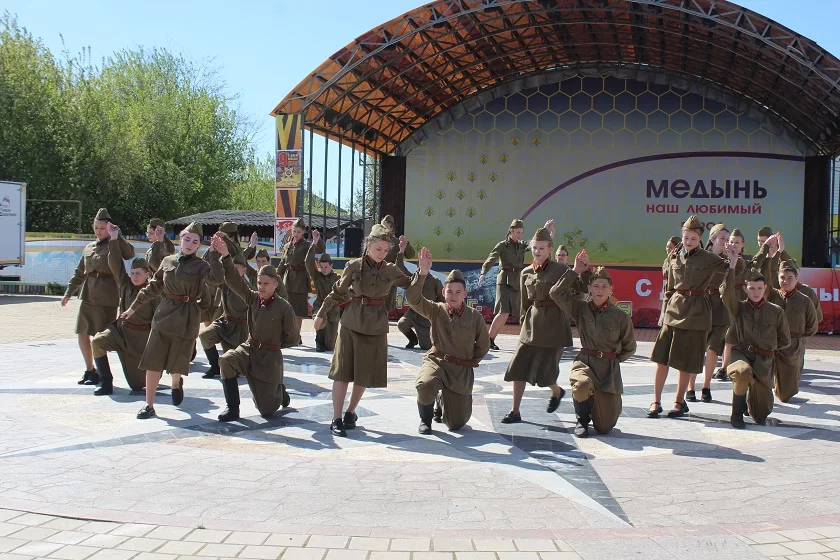 Юные медынцы, ученики средней школы, одетые в военную форму времен Великой Отечественной войны танцевали памятный вальс под знаменитый «Синий платочек». Поставлен же танец был руководителем местного хореографического кружка «Медуница» Ксенией Копышевой.
