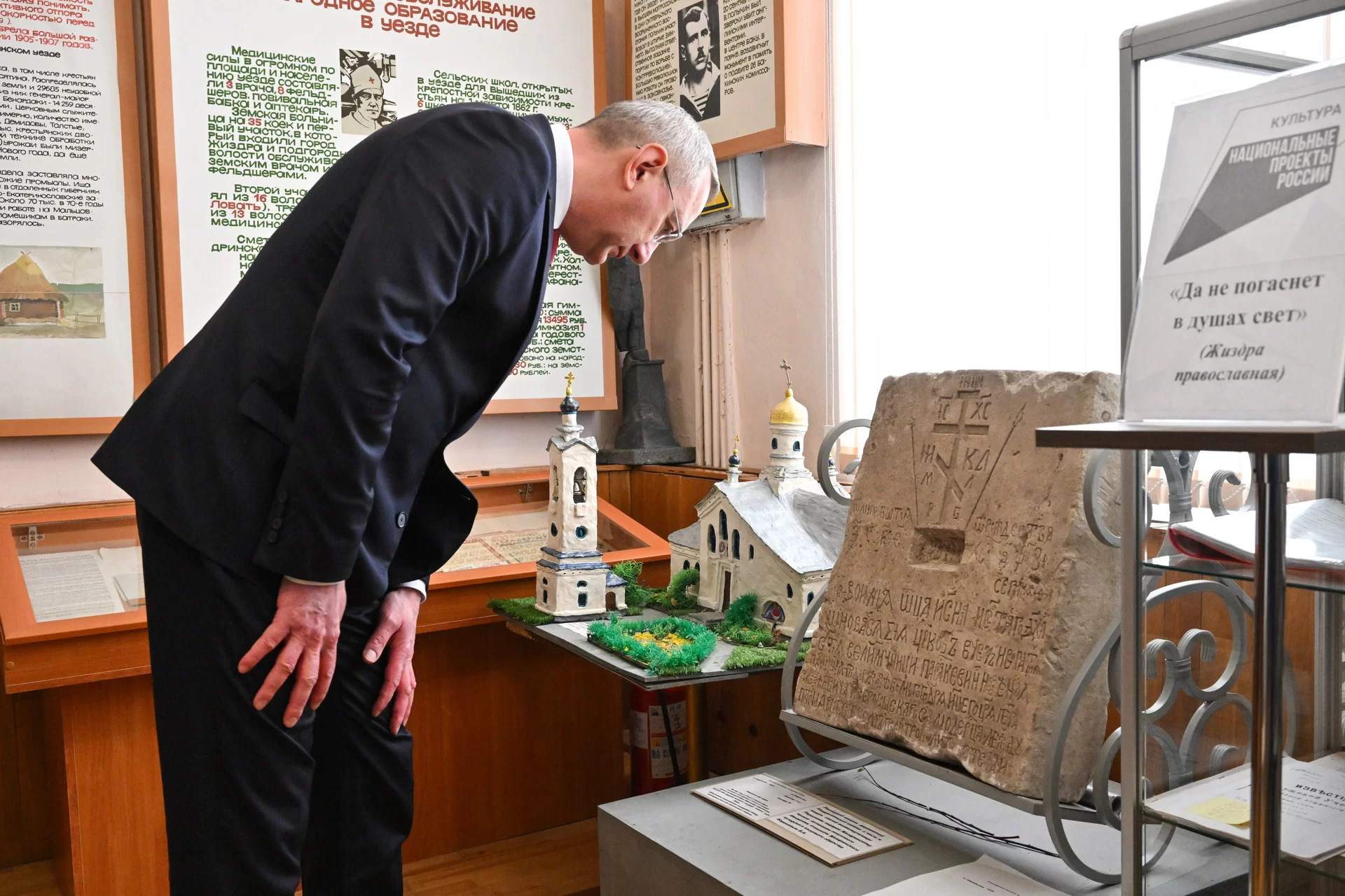 Перед отчетом губернатор побывал в Жиздринском историко-краеведческом музее. Жиздринцы по крупицам собирают выставку об истории, природе и земляках, которыми гордятся. В этой работе участвуют краеведы, учителя и школьники, поисковики. В последнее время музей предоставляет свои площади для волонтеров, которые плетут маскировочные сети для защиты бойцов спецоперации и собирают вещи для отправки на передовую.