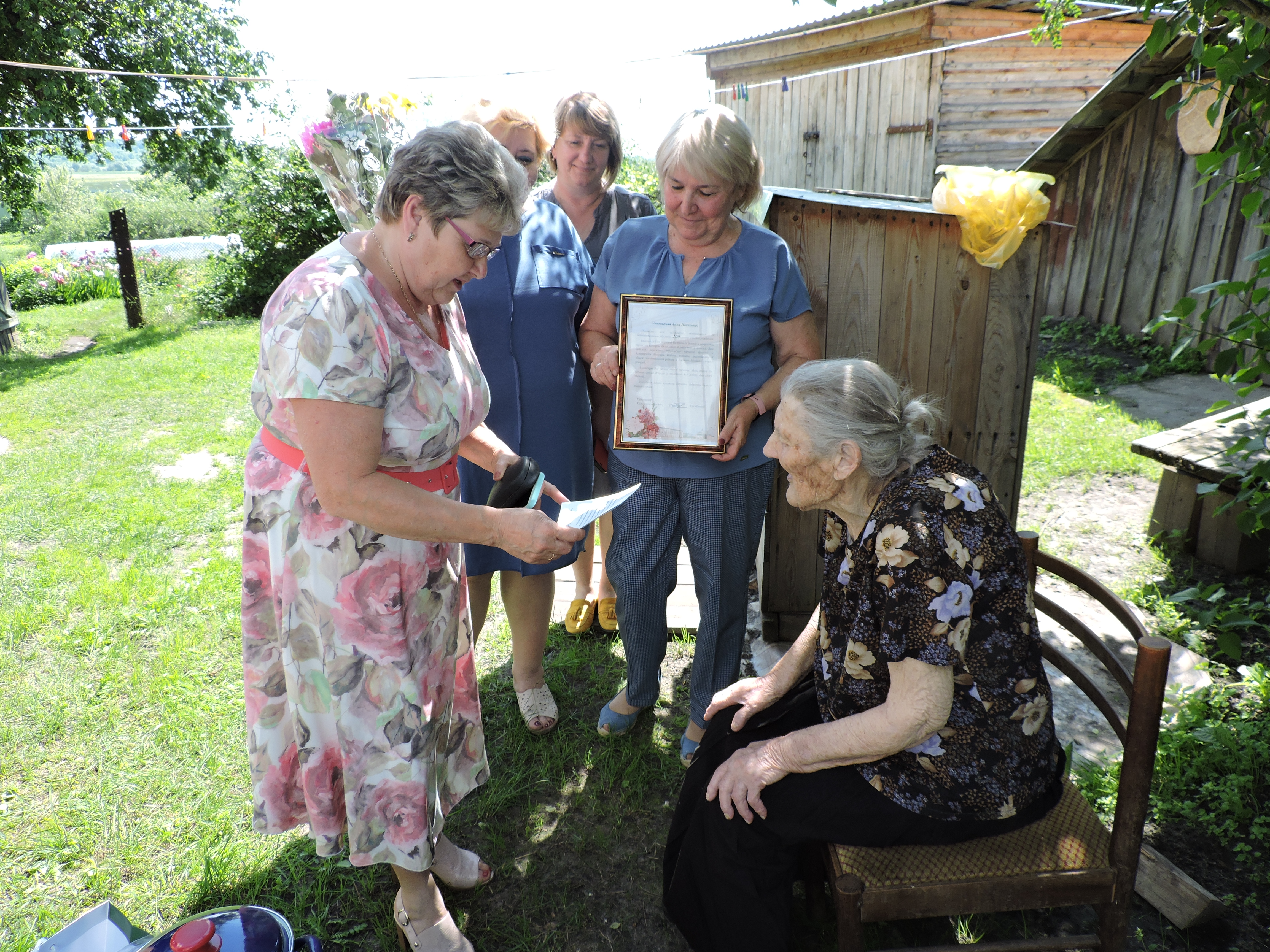 Поздравить юбиляршу приехали глава администрации района Надежда Бадеева, заведующая отделом социальной защиты населения, председатель районного совета ветеранов Людмила Самсонова, заведующая отделением социальной помощи на дому Вера Дугина, заместитель главы администрации села Перемышль Ольга Федорова.Гости поздравили Анну Ивановну с днем рождения, пожелали ей крепкого здоровья, счастья, доброты. Вместе с цветами и подарками ей передали персональный поздравительный адрес от президента страны Владимира Путина и Благодарственное письмо губернатора области Владислава Шапши.