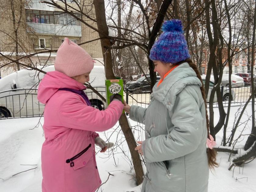 Сегодня учащиеся четвертого класса школы №23 в Калуге месте с сотрудниками регионального Минприроды развесили у школы кормушки и подсыпали в них подкормку для птиц.