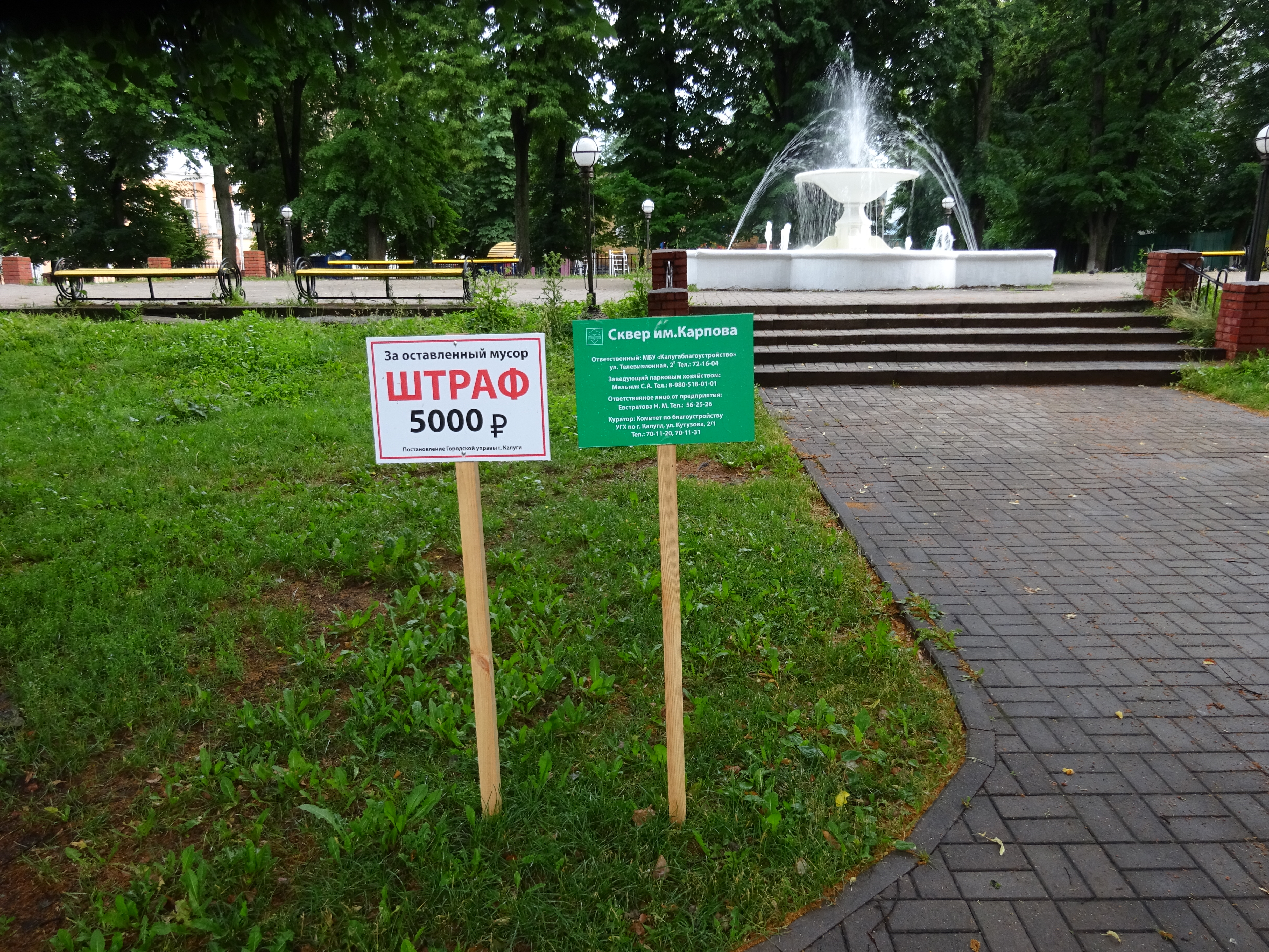 «Сквер Карпова. Ответственный - МБУ «Калугаблагоустройство», ул. Телевизионная, 2б. Телефон: 72-16-04. Заведующий парковым хозяйством - Мельник С.А. Телефон: 8-980-518-01-01. Ответственное лицо от предприятия - Евстратова Н.М. Телефон: 56-25-26. Куратор: комитет по благоустройству УГХ по г. Калуге, ул. Кутузова 2/1. Телефон 70-11-20, 70-11-31».