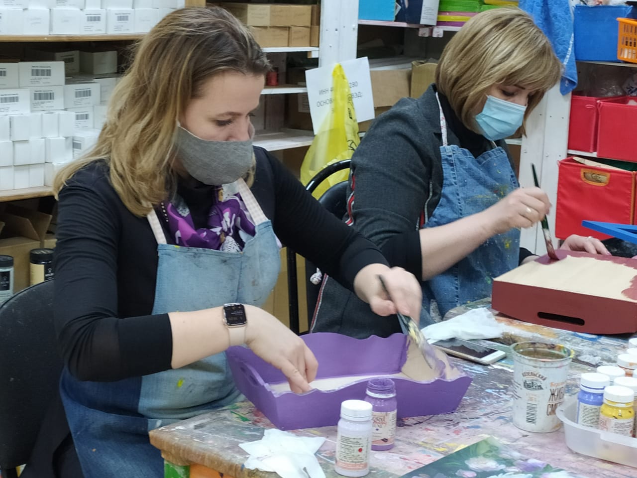 За несколько часов работы они изготовили уникальные декоративные подносы в стиле шебби-шик. Изделия будут выставлены на продажу в группе «Благотворительный аукцион «Мята» в социальной сети ВКонтакте. Вырученные средства пойдут на закупку материалов оборудования для трудовой мастерской, в которой занимаются дети и подростки с ментальными нарушениями.