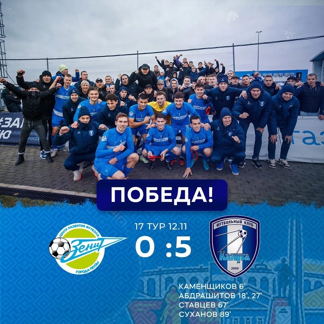 В воскресенье, 12 ноября, завершился чемпионат Второго дивизиона страны по футболу. ФК «Калуга» на выезде встречалась с футболистами пензенского «Зенита». Гости не оставили хозяевам ни шанса. Уже на шестой минуте забил Каменщиков, а затем дублем отметился Абдрашитов. Во втором тайме еще по голу забили Ставцев и Суханов, а ворота «космонавтов» так и остались неприкосновенными. Итоговый счет 0:5. Таким образом, калужане выиграли лигу «Б» Второго дивизиона.