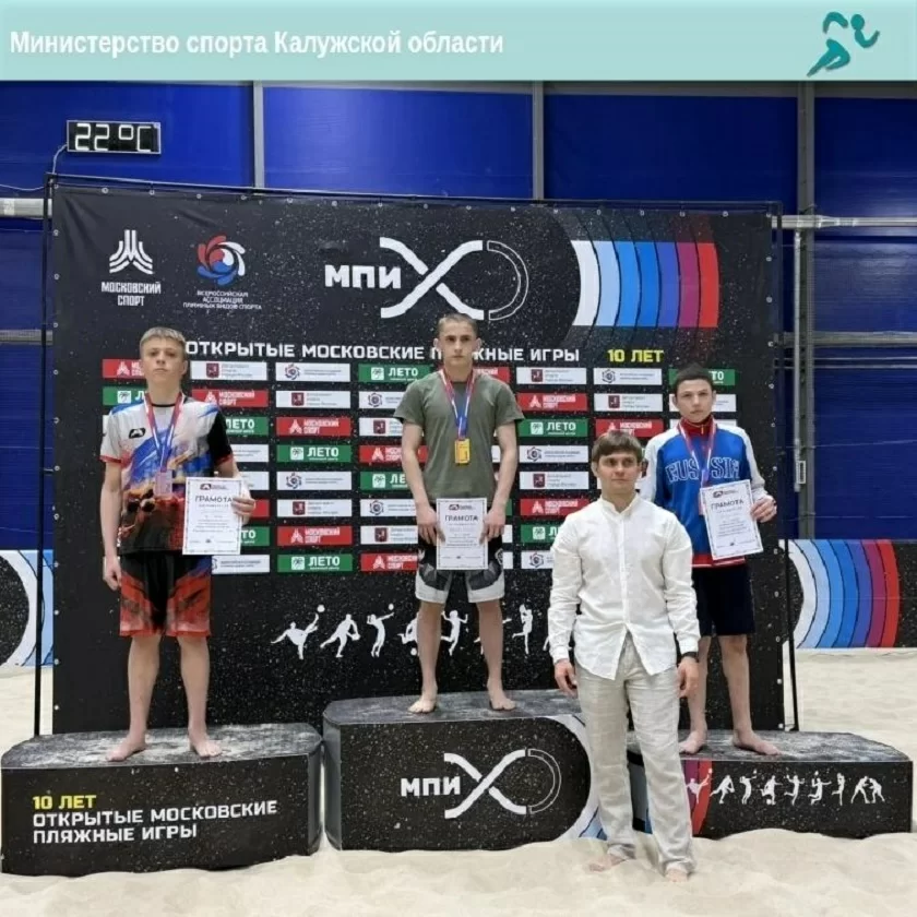 Состязания среди юношей до 18 лет прошли в столичном пляжном центре «Лето». Калужанин Егор Новиков завоевал второе место в весовой категории 60 кг. Кроме того, он выполнил норматив кандидата мастера спорта и вошел в состав сборной России. Его товарищ Никита Потапов выступил в весовой категории 70 кг и занял 5 место.