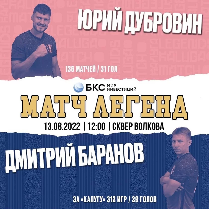 На поле встретятся лучший бомбардир в истории «Калуги» Юрий Дубровин и рекордсмен по количеству матчей Дмитрий Баранов, на чьём счету их 312. Зрители увидят и других звёзд калужского футбола: Виталия Сафронова, Владимира Кисенкова, Ивана Родина, Максима Блинова, Дмитрия Дерябкина, Евгения Лосева и других.