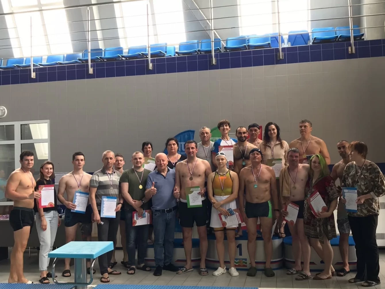 «Получил массу положительных эмоций! Прыгнул с тумбочки № 3 и пришёл третьим. Буду чаще посещать бассейн и всем советую. Мы дадим всем рекордам наши звонкие имена!»