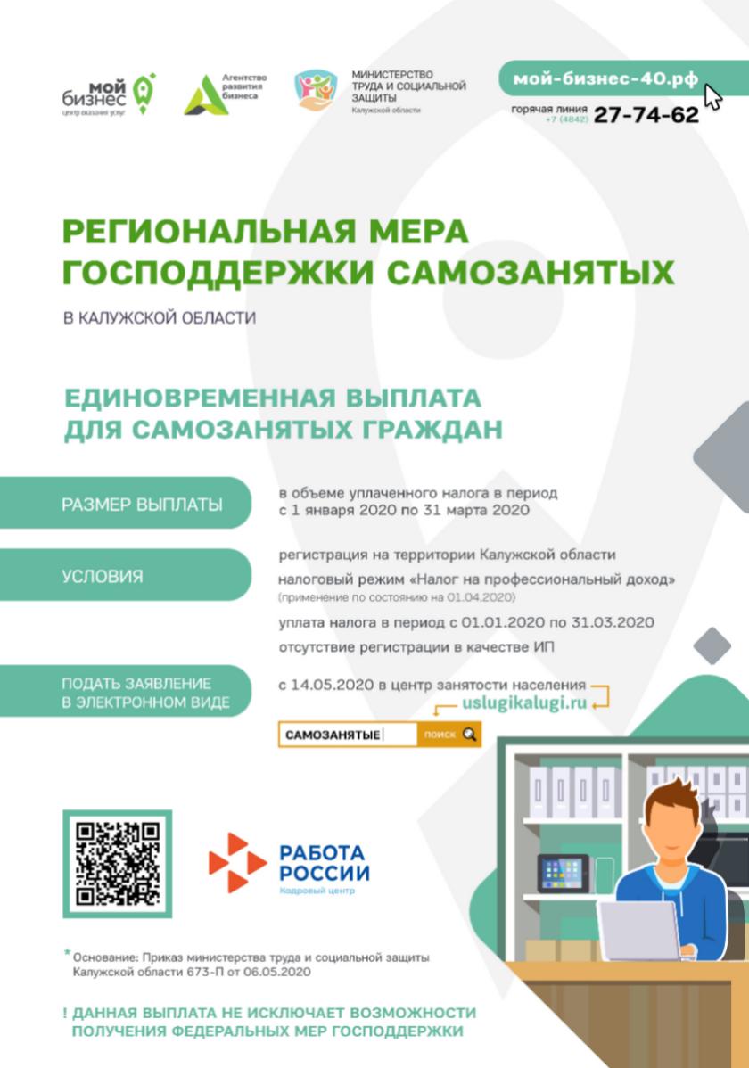 Самозанятые граждане за исключением индивидуальных предпринимателей, проживающие на территории Калужской области, применяющие по состоянию на 1 апреля 2020 года специальный налоговый режим «Налог на профессиональный доход», уплатившие налог на профессиональный доход на территории Калужской области в период с 1 января 2020 года по 31 марта 2020 года имеют право на получение единовременной денежной выплаты.