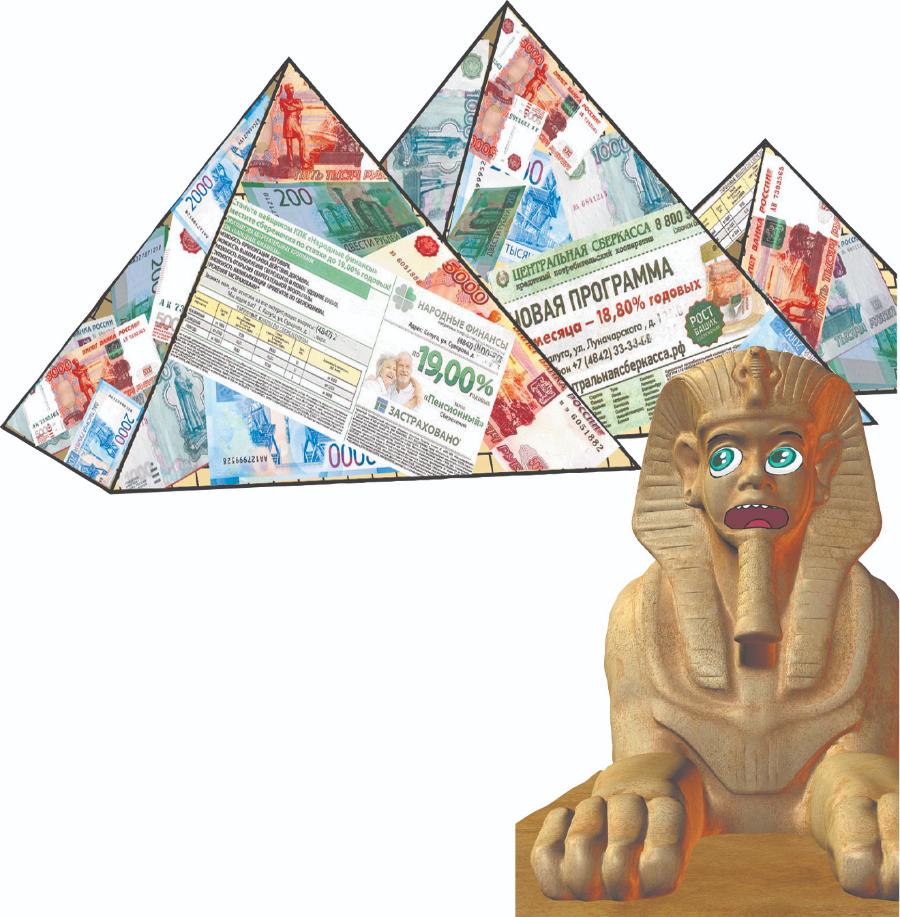 В редакцию позвонила калужская пенсионерка Зинаида Михайловна и со слезами рассказала о том, как её обманула на 42 тысячи рублей «Центральная сберкасса». У многих в памяти отложились надёжные советские сберкассы, правопреемником которых стал Сбербанк. Вероятно, также думали и финансовые мошенники, организовавшие кредитный потребительский кооператив с названием «Центральная сберкасса». И даже логотип себе подобрали схожий со Сбербанком. Сыграли на доверии. И народ (в основном – пенсионеры) потянулся к обещавшим неслыханные барыши мошенникам, обосновавшимся в калужском офисе на улице Луначарского. Эти проходимцы даже не постеснялись выманивать у пенсионеров их последние деньги. Общий выявленный ущерб от их деятельности составил 46 миллионов рублей. Свою нелегальную деятельность на финансовом рынке устроители этой пирамиды строили в два этапа: сначала под вывеской «Центральная сберкасса», а через год – «Центральная сберкасса №1». Когда запахло жареным, офис был закрыт, все телефоны отключены, а обманутые пенсионеры понесли заявления в прокуратуру . В отношении мошенников заведено уголовное дело.Второй пример – ещё одна калужская финансовая пирамида (кредитный потребительский кооператив) с многообещающим названием «Народные финансы». Сначала его организаторы базировались в Севастополе, а в Калуге имели лишь филиал, но потом (видимо, крымчане раскусили пирамиду) переместили офис в Калугу. У доверчивых калужан только по установленным фактам мошенникам удалось выудить 26 миллионов рублей. Уголовное дело в отношении этой пирамиды завершено и направлено в суд.