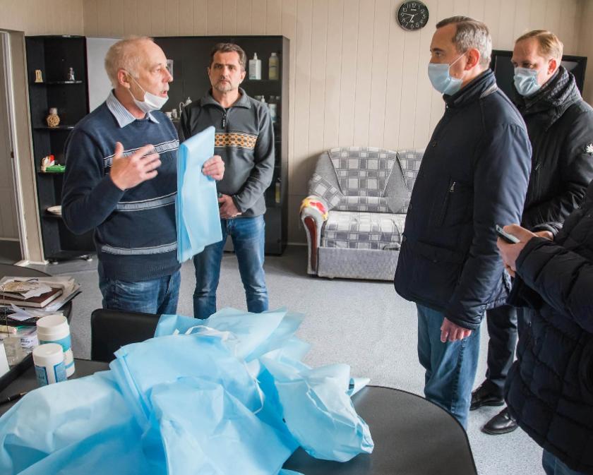 Владислав Шапша поинтересовался объемами производства наиболее востребованных в сегодняшних условиях комплектов одежды для врачей-инфекционистов. В него входят: куртка, брюки, нарукавники, бахилы, халат, шлем, маска.