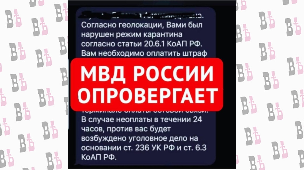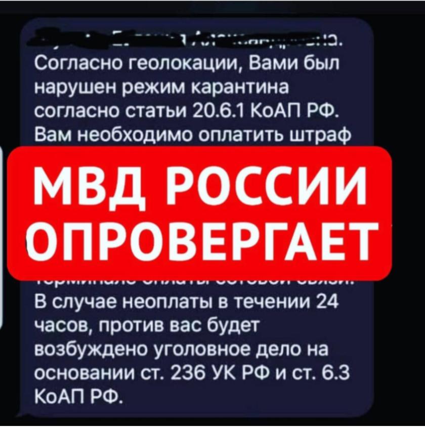 УМВД России по Калужской области предупреждает: это мошенники! Правоохранительные органы не работают с гражданами подобным образом и не штрафуют их за нарушение режима самоизоляции на основании геолокации. Сотрудники органов внутренних дел в ходе рейдовых мероприятий проводят с населением разъяснительную работу о необходимости соблюдения режима самоизоляции.