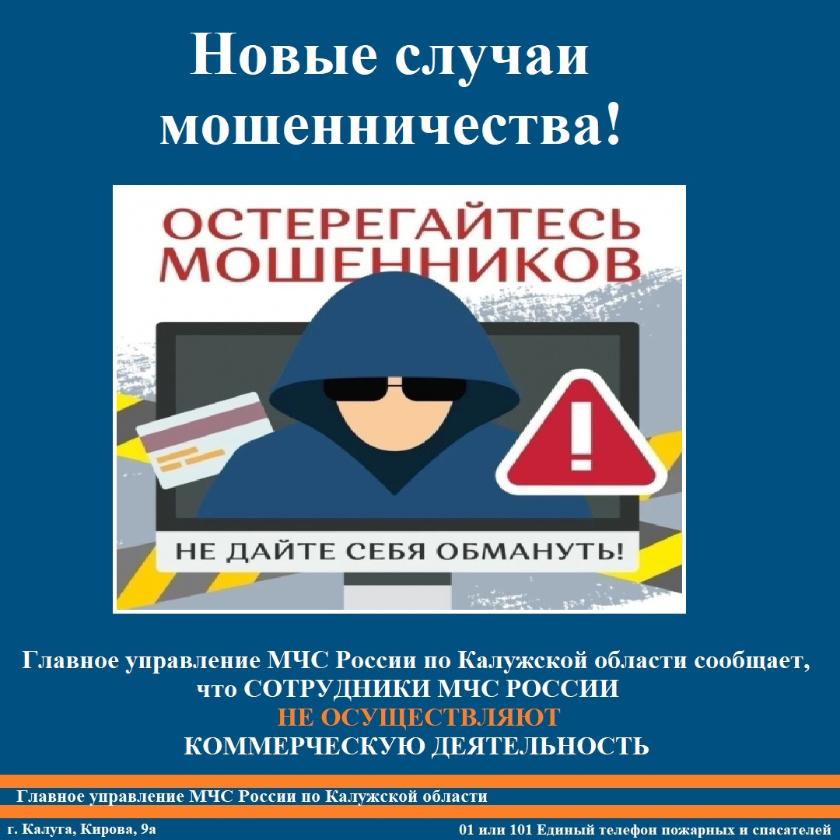 Главное управление МЧС России по Калужской области сообщает, что его сотрудники не выполняют коммерческую деятельность, не занимаются продажей какой-либо продукции. У каждого представителя службы спасения есть удостоверение, он одет в форменную одежду. Если вас пытаются обмануть мошенники, звоните в полицию.