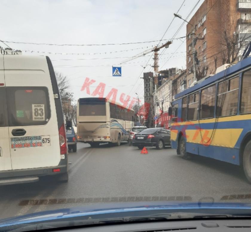 Минимум две легковых машины и автобус перегородили проезд по центральной улице города.