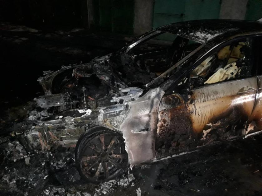 Второй случай произошел ночью 26 января на улице В. Андриановой. Сгорел легковой автомобиль. По фото спасателей видно, что машина сгорела почти полностью.