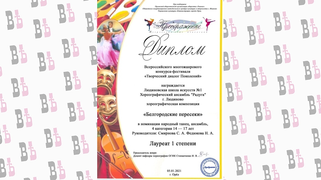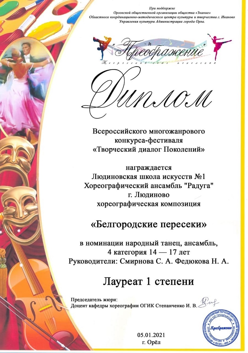 Ансамбль «Радуга» из людиновской школы искусств №1 завоевал первое место за хореографическую постановку «Белгородские песни» и третье место за танец «Черноморочка».