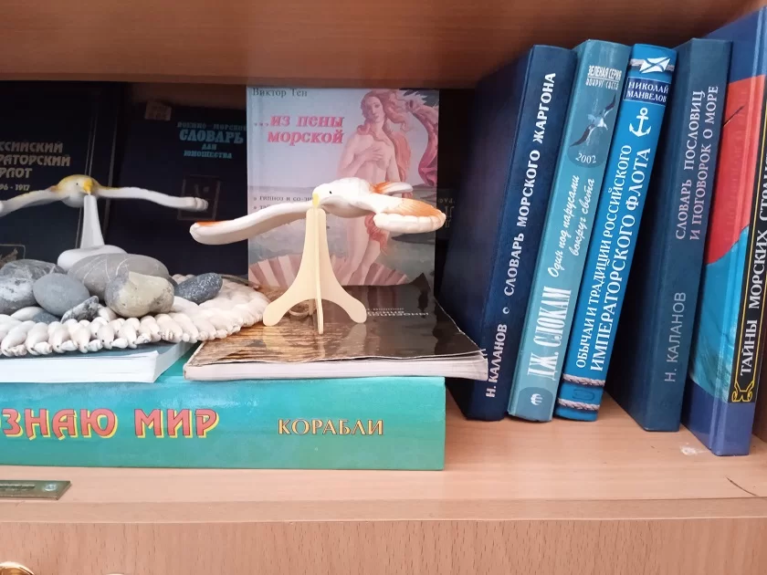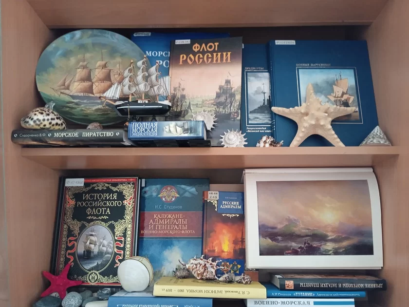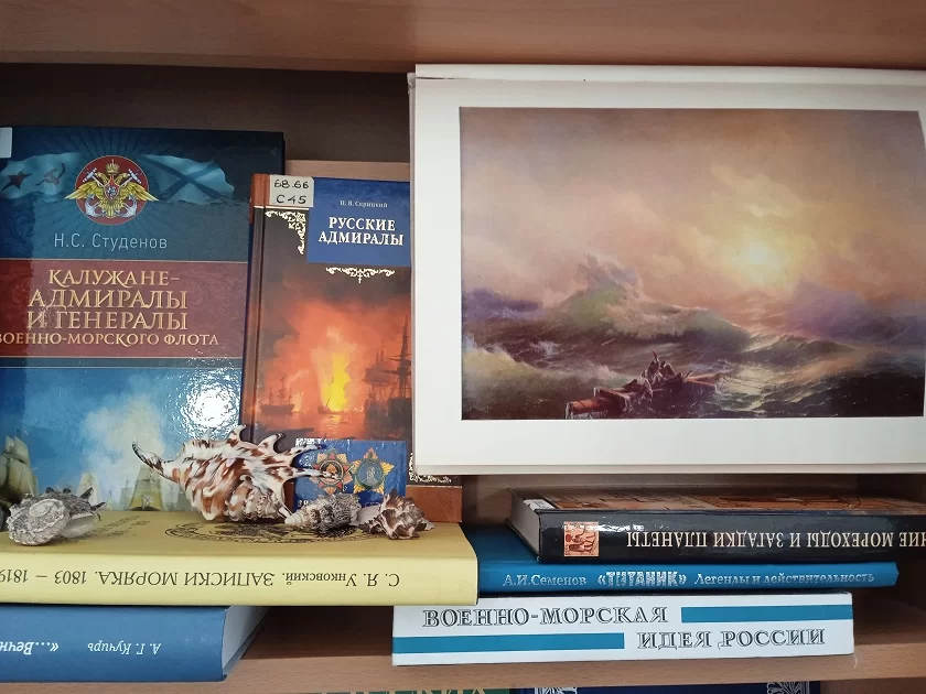 Выставка, в книгах и предметах морской атрибутики рассказывающая о море, получилась красочной и колоритной. Волны, ветер, романтика – здесь есть все. Литература на книжных полках знакомит с первооткрывателями новых земель и исследователями глубин, морскими баталиями, летописью Российского флота, в том числе флотоводцами Калужской земли. Хочется отметить книгу Н. С. Студенова «Калужане – адмиралы и генералы Военно-морского флота». В ней – судьбы людей, связавших свою жизнь с морем, прославленных дворянских родов Сенявиных, Унковских, Голицыных, Лопухиных и многих других. Еще одна книга, «Записки моряка» С. Я. Унковского, посвящена его кругосветному путешествию. Унковские – известная калужская династия, давшая России много выдающихся людей.В создании экспозиции использованы предметы из частных коллекций.