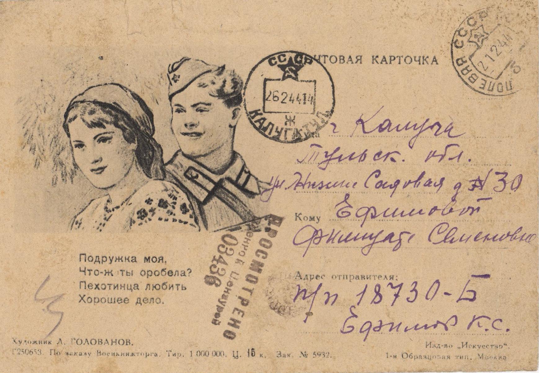 Это письмо написано было в феврале 1944 года. На адресной стороне карточки рисунок – бойцы, юноша и девушка, и четверостишие: «Подружка моя, что ж ты оробела? Пехотинца любить – хорошее дело». Открытка была выпущена издательством «Искусство». Номер полевой почты: 18730-Б, на штемпеле стоит дата отправления - 21 февраля 1944 года. Штамп «Просмотрено военной цензурой» стоит на всех карточках.