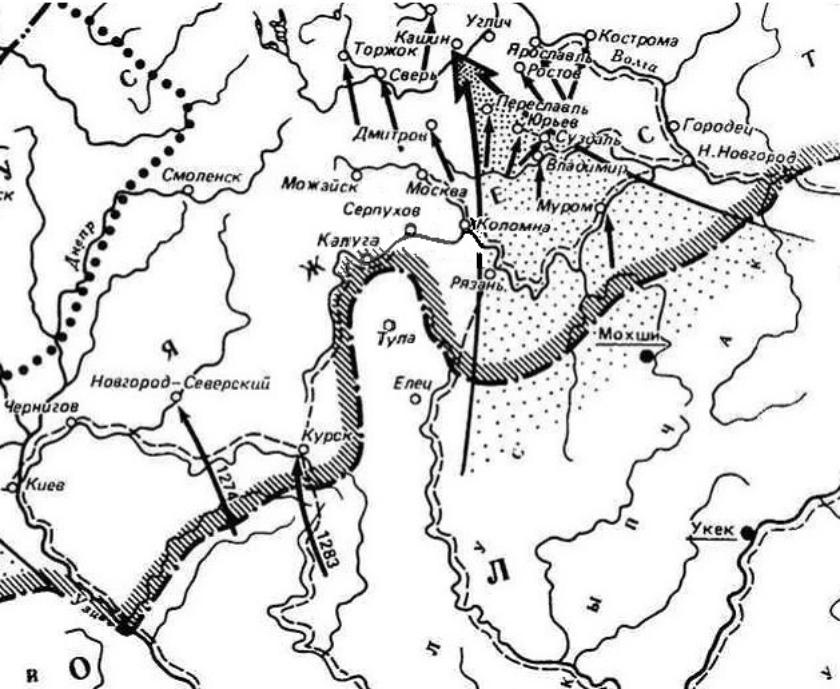 Итак, в 1260 г. Берке-хан в улусе мужа своей сестры князя Картана основал на левом берегу Оки на заброшенном пепелище Корьдно северную ордынскую пограничную Калугу-заставу с причалами, заставными домами, складами, постоялыми дворами с ямщиками и с ремесленными слободами. Застава прежде всего имела большое экономическое и политическое значение, а значит, организация функционирования таможни и сбора пошлин была отлажена сразу же.