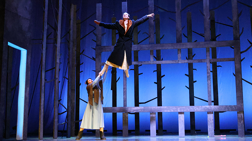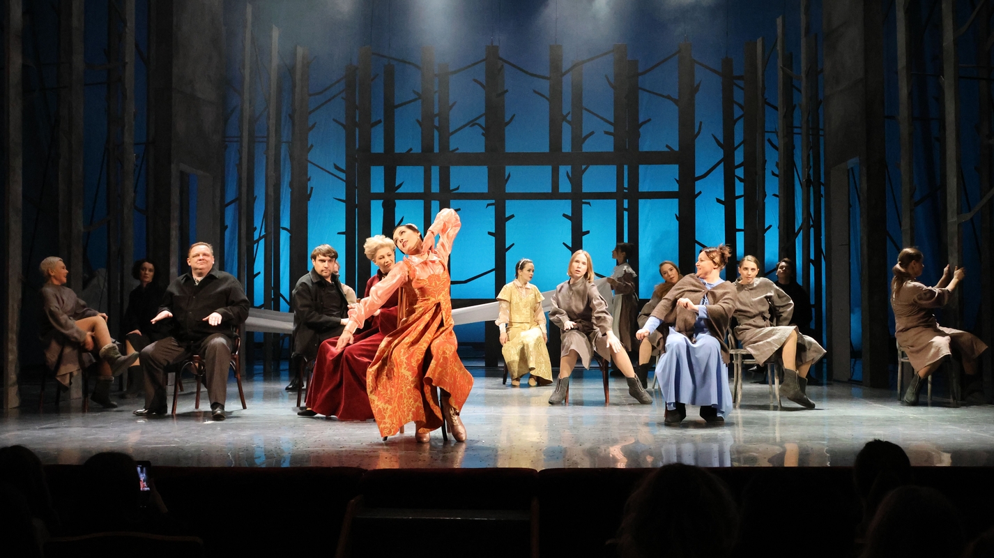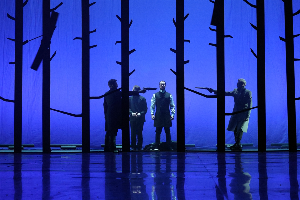Чтобы зритель воочию убедился, как статична, скучна и непроглядно сера жизнь в деревне, где поселился Евгений, режиссер Тришин и художник-постановщик Данила Травин делают гениальный ход. Декорации на сцене изображают черные столбы деревьев – лес, холодный и пустой, он же деревня, – железобетонная скука.