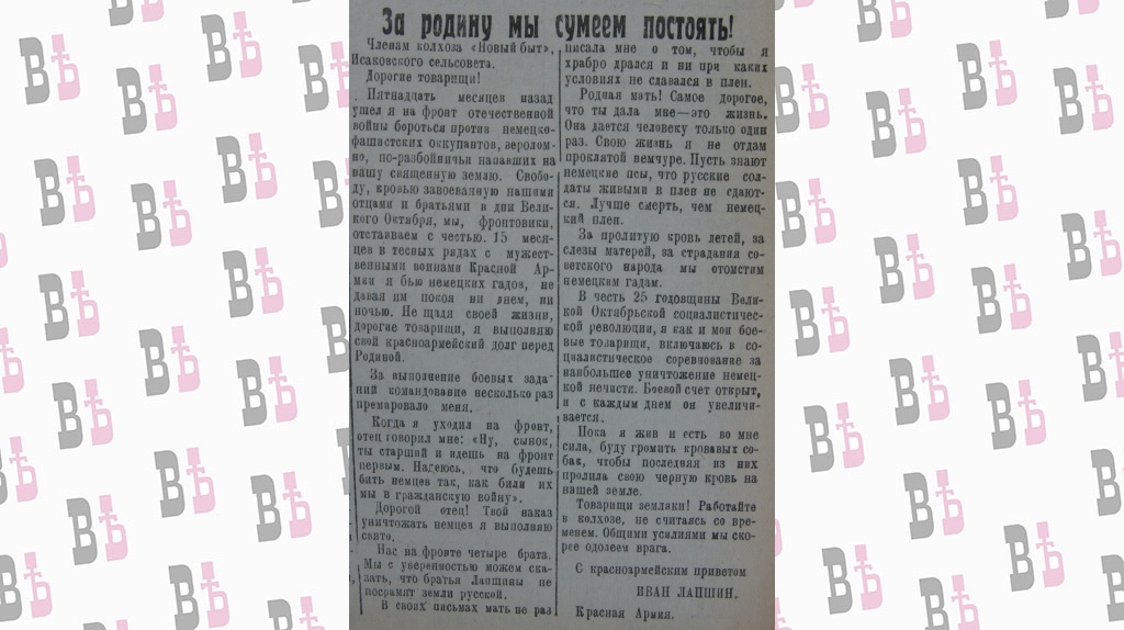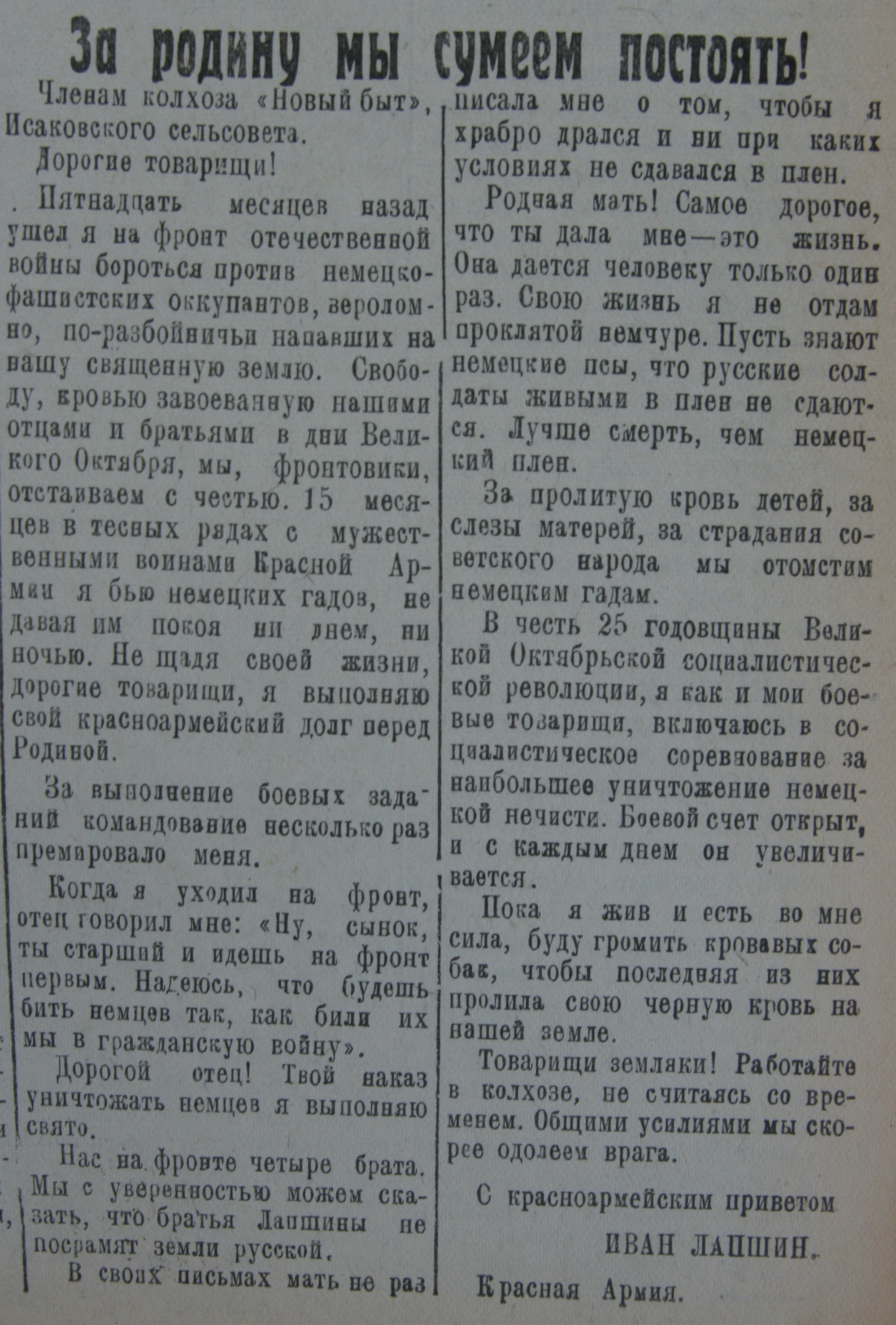 Тарусская газета «Октябрь» озаглавила это письмо громко: «За Родину мы сумеем постоять!». Весточка от земляка была опубликована в субботу, 17 октября 1942 года, на первой странице, сразу под сводкой Информбюро. Рядом, как обычно, стояли заметки о самом актуальном, что происходило в военных колхозах: подъёме зяби, выполнении государственных поставок, утеплении помещений для скота…