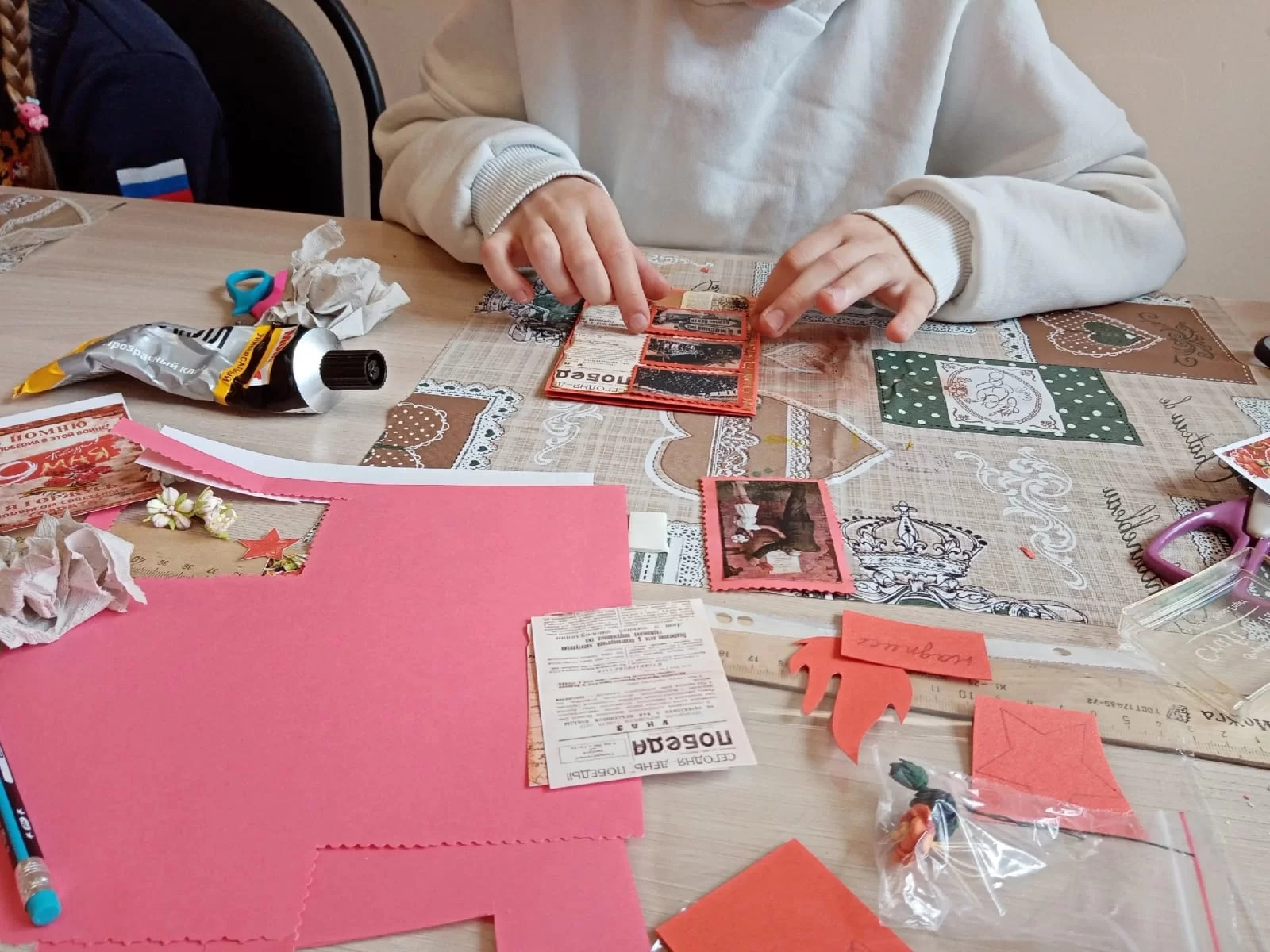 Участники вместе с мастером Натальей Собенниковой сделали открытки в технике скрапбукинг. Главное для такой открытки – правильное расположение элементов на главной странице: так, чтобы не терялось основное изображение, а дополнительные картинки, фигурки и элементы декора лишь подчеркивали красоту композиции.