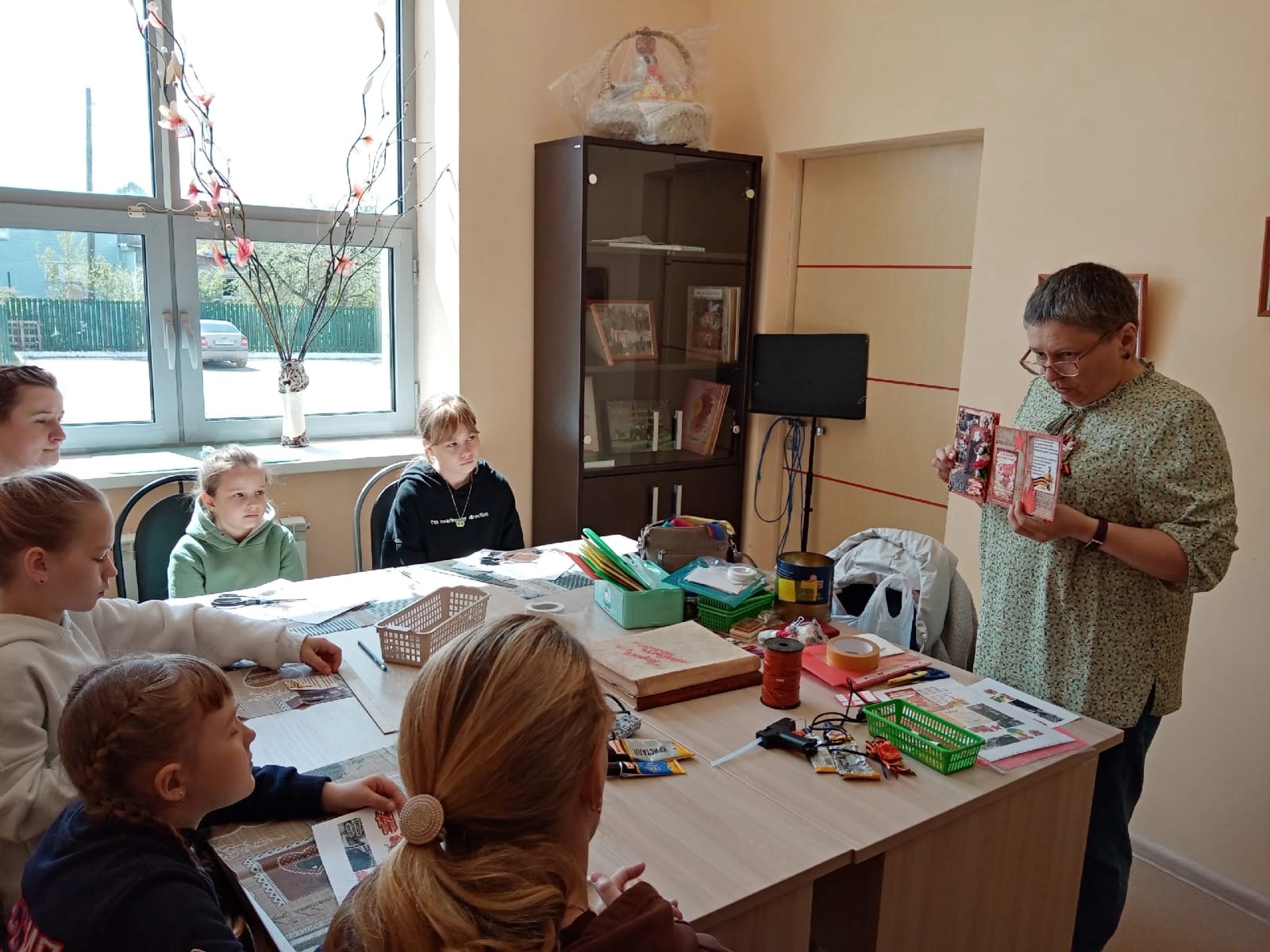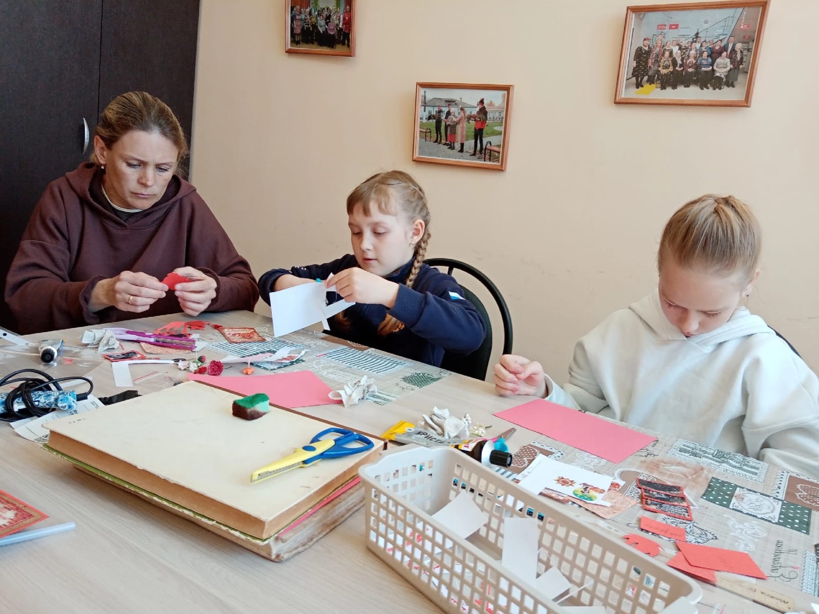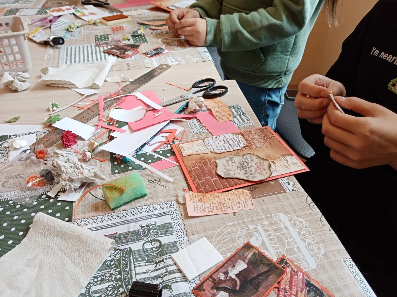 Участники вместе с мастером Натальей Собенниковой сделали открытки в технике скрапбукинг. Главное для такой открытки – правильное расположение элементов на главной странице: так, чтобы не терялось основное изображение, а дополнительные картинки, фигурки и элементы декора лишь подчеркивали красоту композиции.