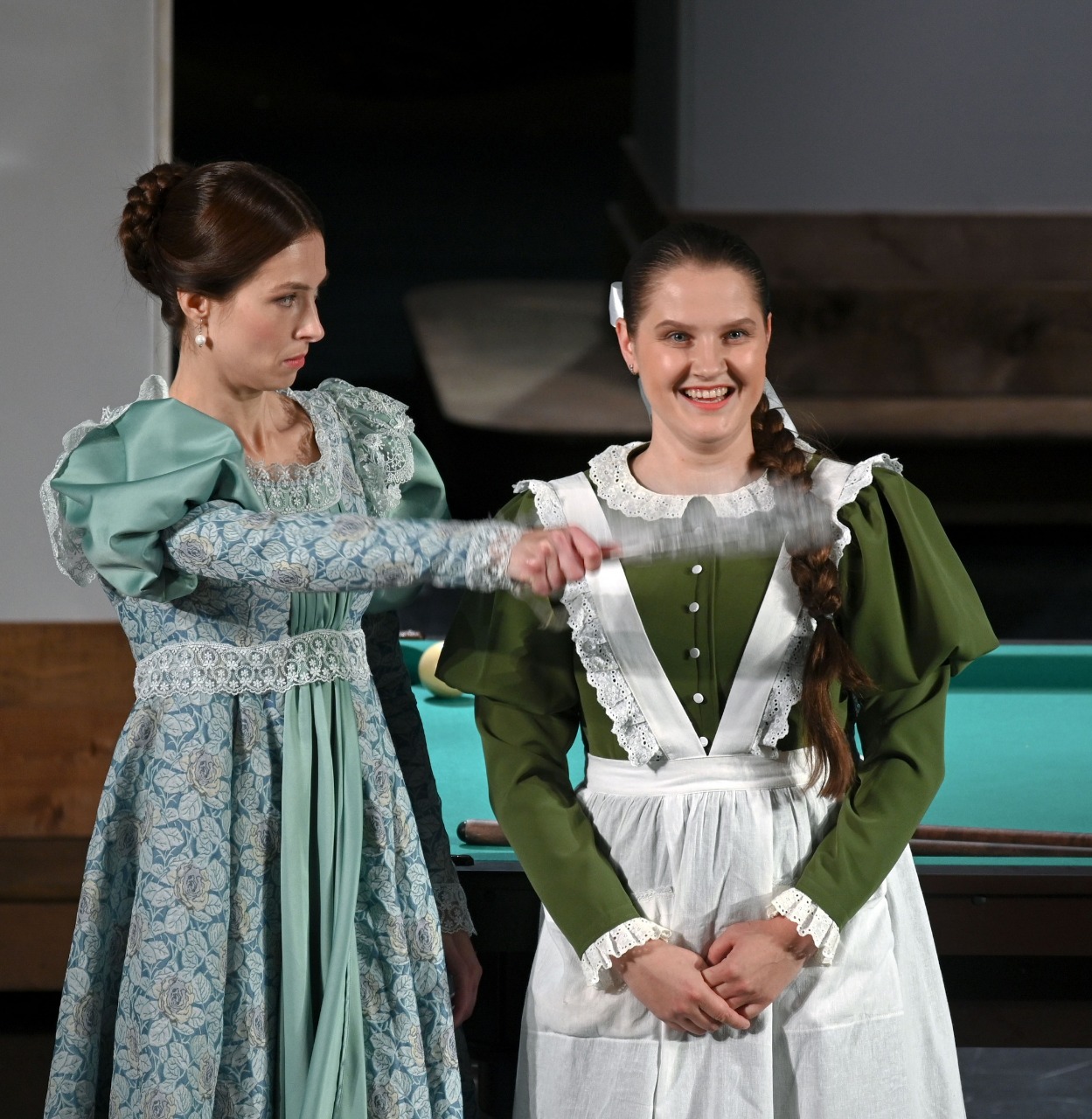 Необычно прочтение Грибоедова. Следя за постановкой, вдруг ловишь себя на мысли: в ней нет положительных героев, в каждом какой-нибудь изъян имеется, а то и целый букет. В школе нам давали понять, что положительный – Чацкий. Человек поездил по миру, имеет свое суждение, высказывает мысли, новые для той эпохи. Однако на сцене драмтеатра он предстает самоуверенным кривлякой, которого на самом деле волнует только он сам. Ни чувства девушки, которую он якобы любит, ни переживания ее отца, которому он вроде бы друг, не беспокоят его. Он любуется собой. Так и хочется сказать: «Бедная Софья, нет ведь рядом достойных тебя женихов». Софья представляется уже не такой ветреницей при этом Чацком. И даже Молчалин. Другое поколение режиссеров и актеров по-иному представляет события и персонажей.