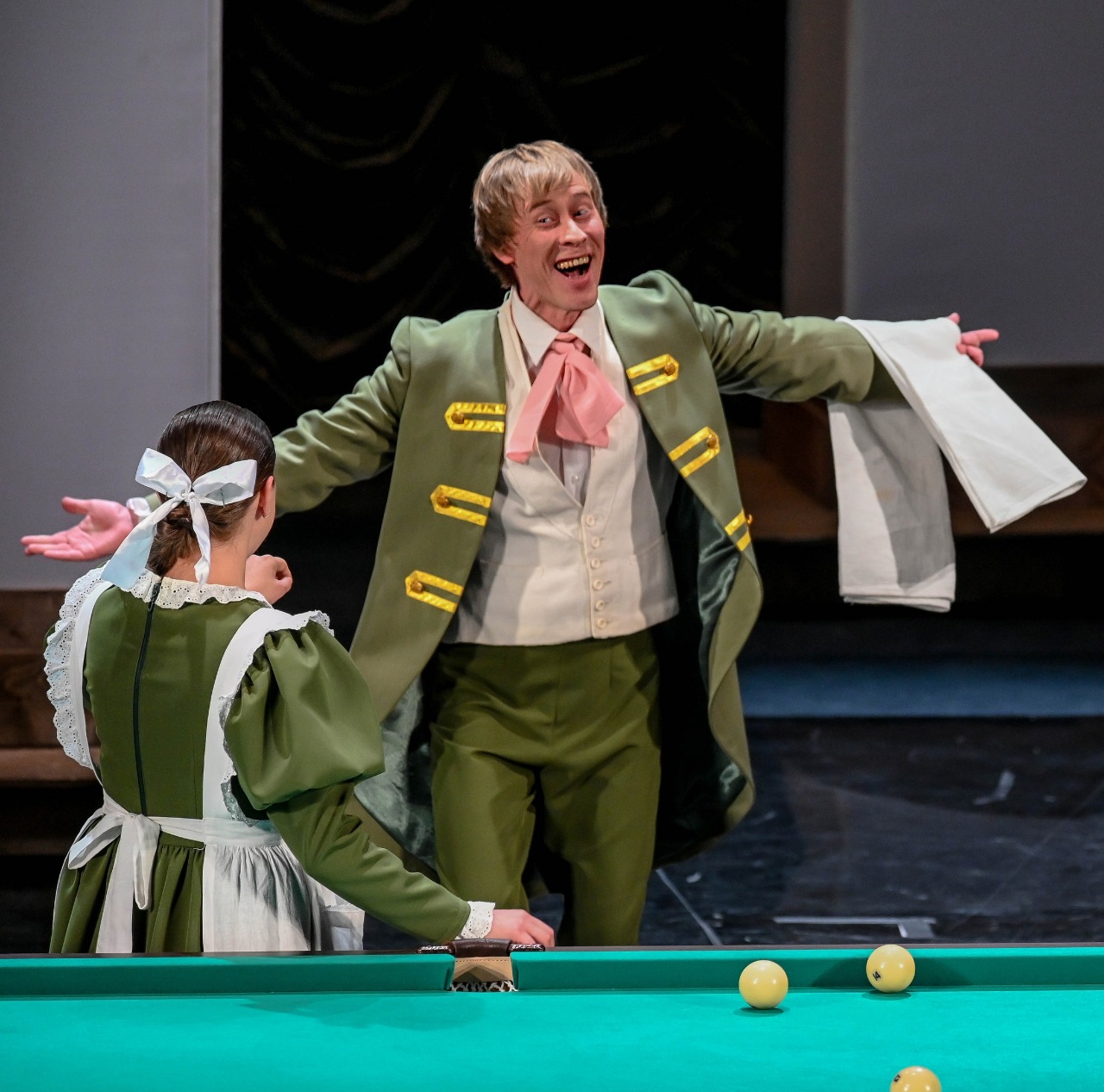 Но играют чудесно! Даже маленькие роли очень выразительны. А уж Лизонька в исполнении Елены Коротковой, Сергей Лунин в роли Фамусова, Петруша, созданный Сергеем Путинцевым, Молчалин – Дмитрий Казанцев – это же огонь. Очень органично они смотрятся на сцене. Да и Софья (Анастасия Семесенко) глядится мило и вполне соответствует образу барышни XIX века. А каким сотворил Чацкого Виталий Бессонов – обаятелен и омерзителен одновременно! И пластика движения неимоверная. Актеры, все без исключения, говорили со сцены стихами легко и непринужденно. А как современен Грибоедов! Ведь и до наших времен дожили высмеиваемые им пороки.