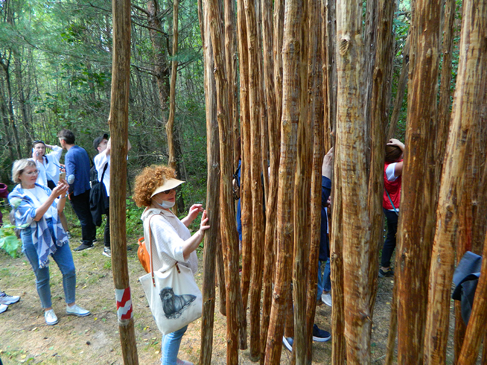Помимо концептуального жилища в арт-парке в этом году появились и авторские художественные объекты. Благодаря финансированию, полученному из Фонда президентских грантов, удалось создать «Непроходимую рощу» – инклюзивное пространство для всех гостей фестиваля, которое представляет собой сотни свисающих почти до земли грубо обработанных стволов ольхи. Посетителям предлагают пройти сквозь нее, испытав шершавую древесину на ощупь, вслушиваясь в перестук стволов и вдыхая ее запах.