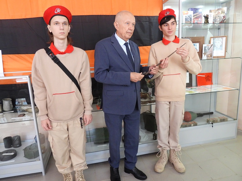 «» «В свое время поисковики подарили мне этот штык – нож. Это легендарное оружие, штык от знаменитой трехлинейки. Враг боялся его как огня, так как раны от него незаживляемые», – отметил Виктор Бабурин.Историко - краеведческий музей в Износковской школе создан в 2004 году. За это время в нем собралась большая коллекция документов и предметов, рассказывающих об историческом, природном и культурном прошлом Износковского округа. Книги, альбомы, изобразительные материалы, предметы быта, произведения искусства и ремесла, артефакты времен Великой Отечественной войны, предметы, хранящие память о доблестных земляках, а также информация о современных героях – участниках специальной военной операции. Сейчас основной фонд музея насчитывает более 800 предметов.