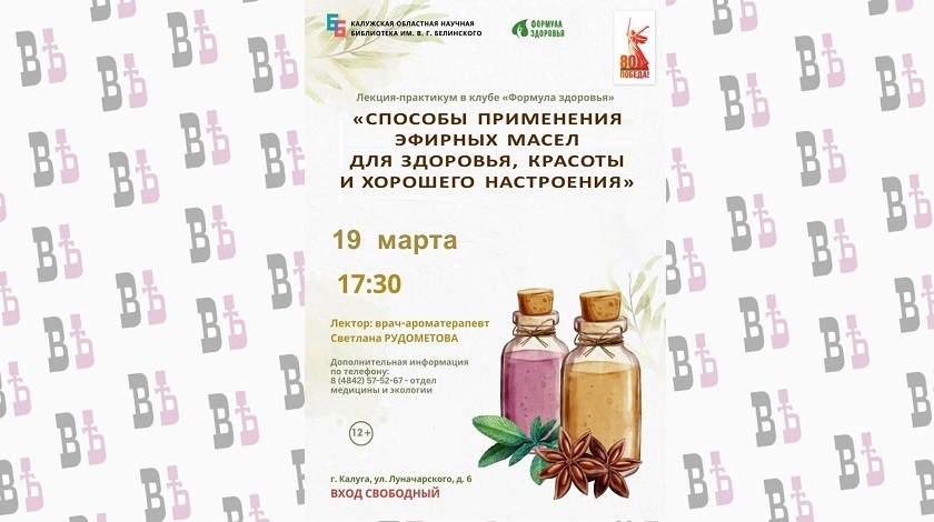 Начало запланировано на 17:30, сообщают в администрации библиотеки. Перед калужанами выступит врач-арома-терапевт Светлана Рудомётова, которая расскажет о способах использования масел для здоровья, красоты и хорошего настроения.