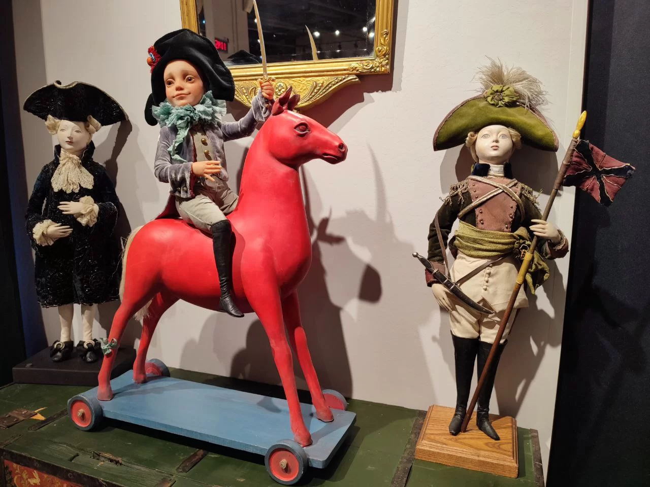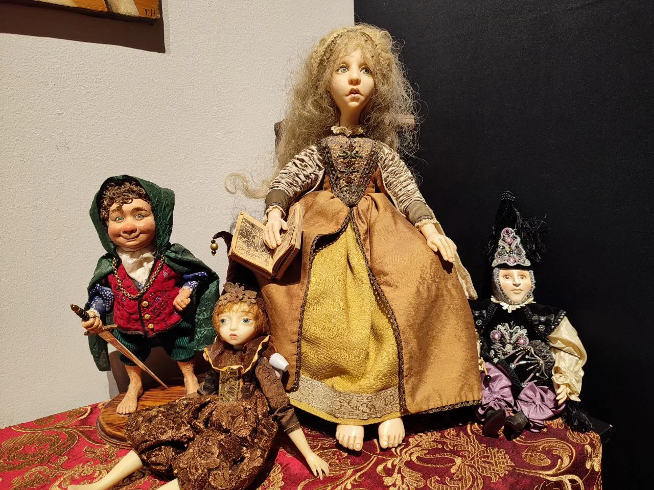 Литературные персонажи здесь пересекаются с фантазийными образами. Вот сплетничают на розовом диванчике дамы, вот собралась группа циркачей. Есть и старинные медведи, и стенд, посвященный образу деревянного мальчишки-проказника Буратино (это, кстати, произведения нашего земляка – мастера по дереву из Тарусы Виктора Назарити). А еще – часовщик, фонарщик и игроки, азартно играющие в нарды. Также на выставке можно познакомиться с историческими костюмами и авторской мебелью.