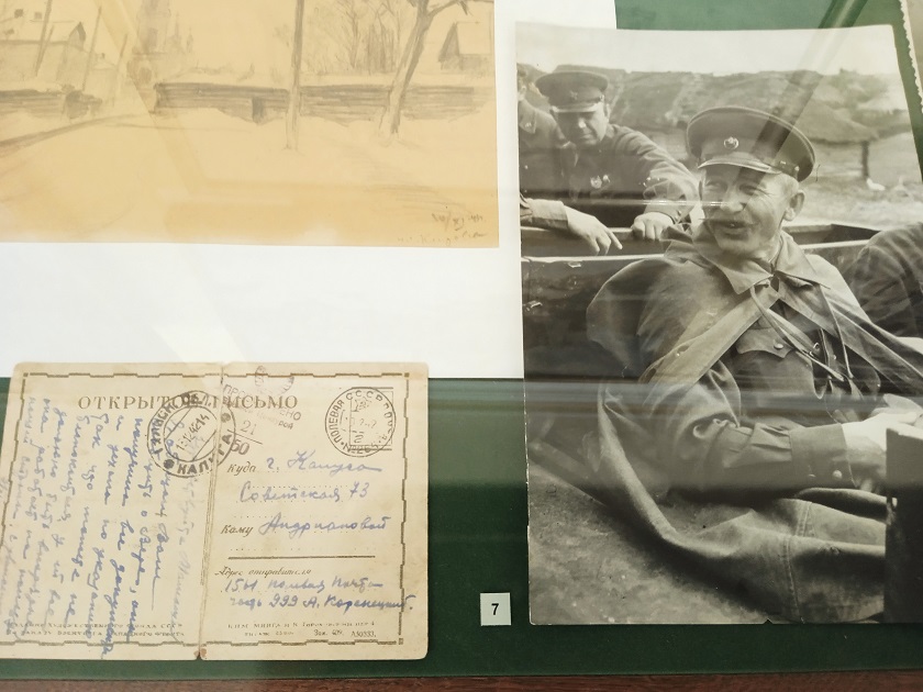 Также в витринах представлены исторические фотографии, документы и письма с фронта в Калугу. Одно из них адресовано матери Веры Андриановой, комсомолки, разведчицы-радистки с позывным «Галка», которая попала в плен, а во время расстрела не встала на колени перед фашистами, как того от нее требовали. Это письмо датировано 9 декабря 1942 года. Среди фотографий есть снимки известного фотокорреспондента ТАСС Михаила Савина, прошедшего всю войну с камерой.