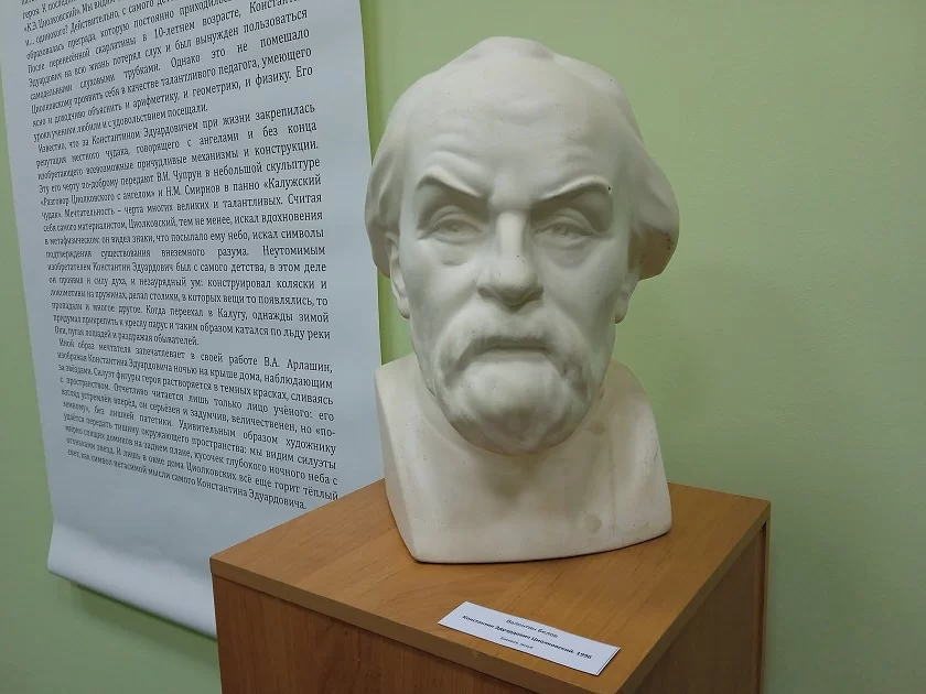 Героем этих произведений прежде всего стал Циолковский-человек со своими мыслями, переживаниями, обыденной жизнью. В них личность великого ученого раскрывается именно с этой стороны. Например, несколько произведений отражают его увлечения. Известно, что у Константина Эдуардовича была репутация калужского чудака, говорящего с ангелами и изобретающего различные механизмы и конструкции, от аэростатов, аэропланов и ракет до саней под парусом, на которых он катался зимой. Скульптор Владимир Чупрун изобразил Константина Эдуардовича, беседующего с ангелом, а его коллега Николай Смирнов – Циолковского, катающегося на коньках. Сегодня этим никого не удивишь, но в то время было совсем неожиданно встретить взрослого человека на коньках.«Из-за проблем со слухом у Циолковского было отстраненное отношение к жизни, ему было трудно общаться с людьми. Возможно, поэтому у него присутствовала некая отрешенность от мирских проблем и забот. Но при этом Циолковский мог проявить свой внутренний мир», - дополнил Станислав Баранов.