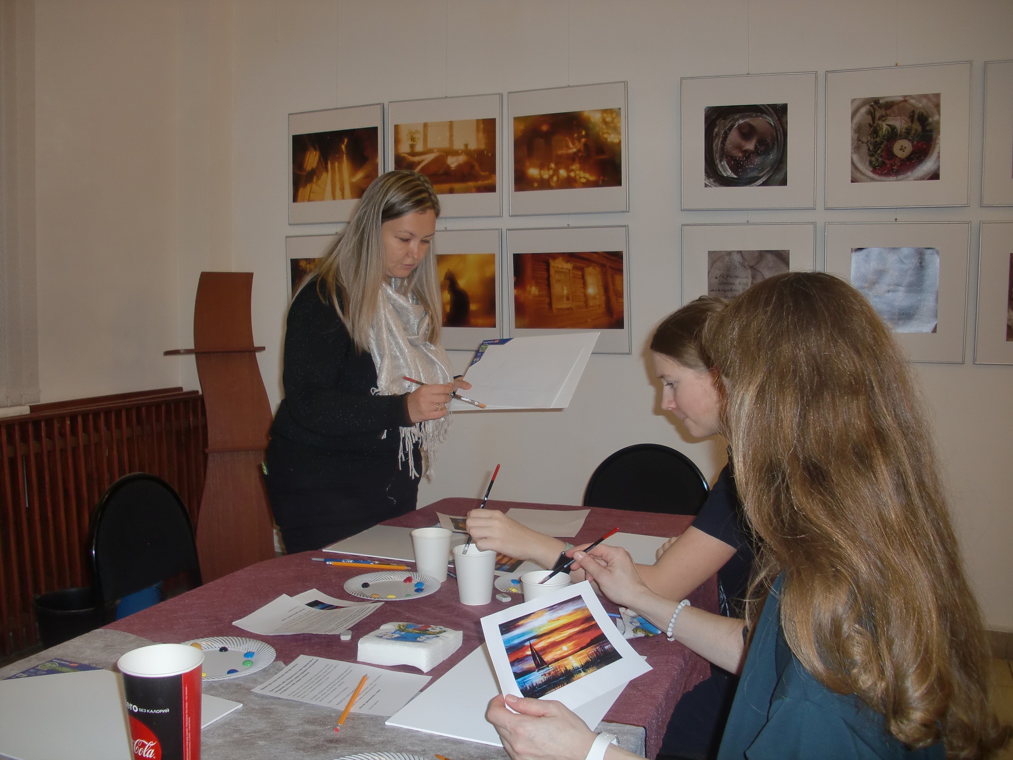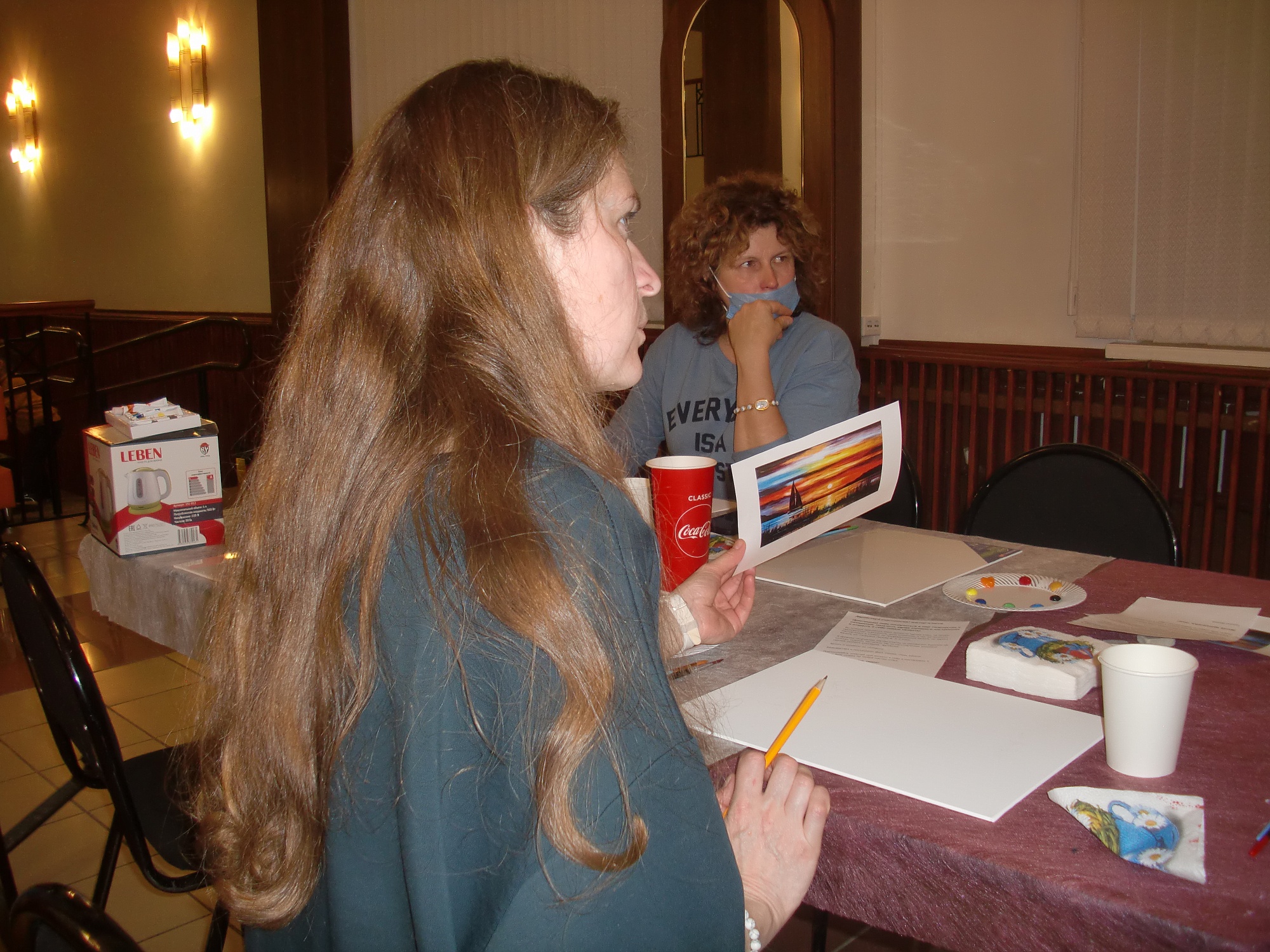 Участники занятия писали пейзаж. Одной из задач было здесь – передать цвет. Сама природа – талантливый художник. Нас окружает цветовое многообразие что, безусловно, дает вдохновение всем творцам. И на мастер-классе теплые цвета красок придавали выразительность даже еще незавершенным картинам.