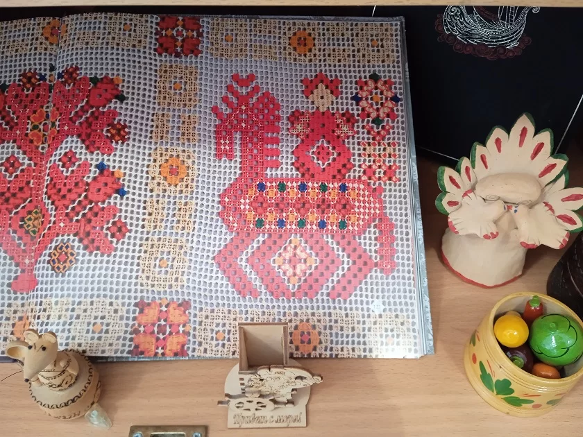 Нашла свое место на выставке и вышивка. В России всегда славились вологодские и елецкие кружева – кружева, сплетенные на коклюшках. Но кружевных дел мастерицы были также в других губерниях, в том числе в Калужском крае – у нас бытовала цветная тарусская перевить. В экспозиции, наряду с изданиями по промыслам, представлена книга искусствоведа Светланы Личенко, которая собрала материал по истории народного искусства нашего региона в XIX – XX веках. Обложку ее украшает фотография хлудневской игрушки – еще одного знаменитого промысла, ставшего брендом Калужской области.