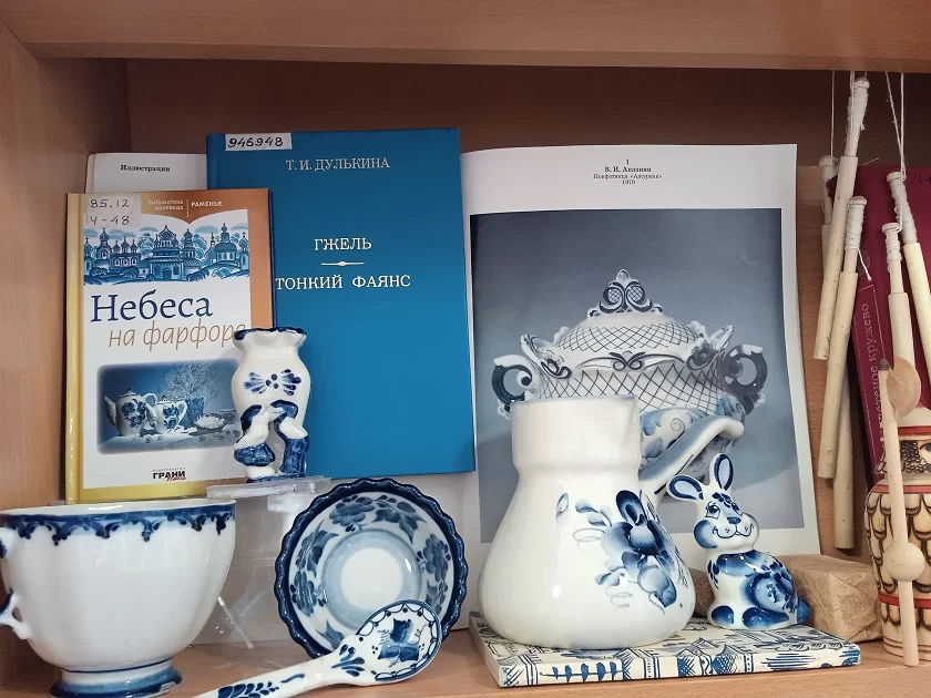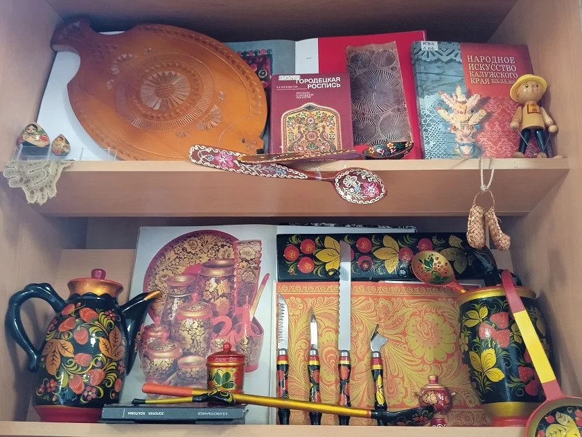 В экспозиции помимо книг представлен богатый предметный ряд – ложки и коллекция ножей, рукоятки которых расписаны в технике хохломы, ваза, изящная чашечка и турка для кофе с сине-голубым узором гжели, когда-то ее называли «небеса на фарфоре». Красивы жостовские подносы в ярких цветочных орнаментах.