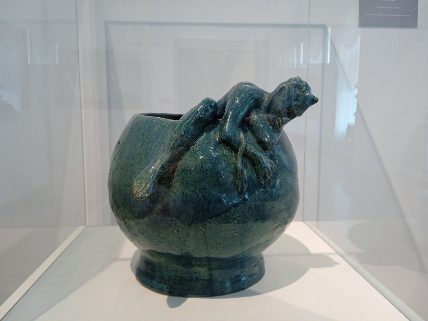 Ярким украшением выставки служат ваза в «неорусском» стиле и скульптурная композиция «Похищение Европы».