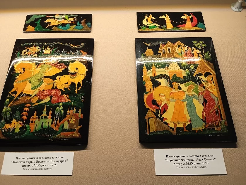 Основная тема, которая «звучит» в лаковом творчестве, – иллюстрации русских сказок: «Емеля», «Иван-царевич и Марфа-царевна», «Три царства - медное, серебряное и золотое», «Марья Моревна», «Иван-царевич и Белый Полянин», «Жар-птица и Василиса-царевна». Эти сказки и иллюстрации к ним привлекают внимание посетителей выставки.