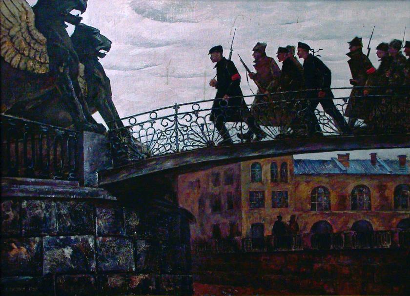 — Эта работа располагает к тому, чтобы вспомнить поэму Блока «Двенадцать». Конечно, два произведения связаны между собой чисто визуально, но когда я увидел в фондах картину Дмитрия Петровича Бучкина, у меня она сложилась с образом блоковской поэмы, - рассказывает сотрудник выставочного отдела музея Станислав Баранов. — Оба произведения создают образ эпохи. Блок своей поэмой заявил о приверженности делу революции. Полотно Дмитрия Бучкина выражает ее героический характер.