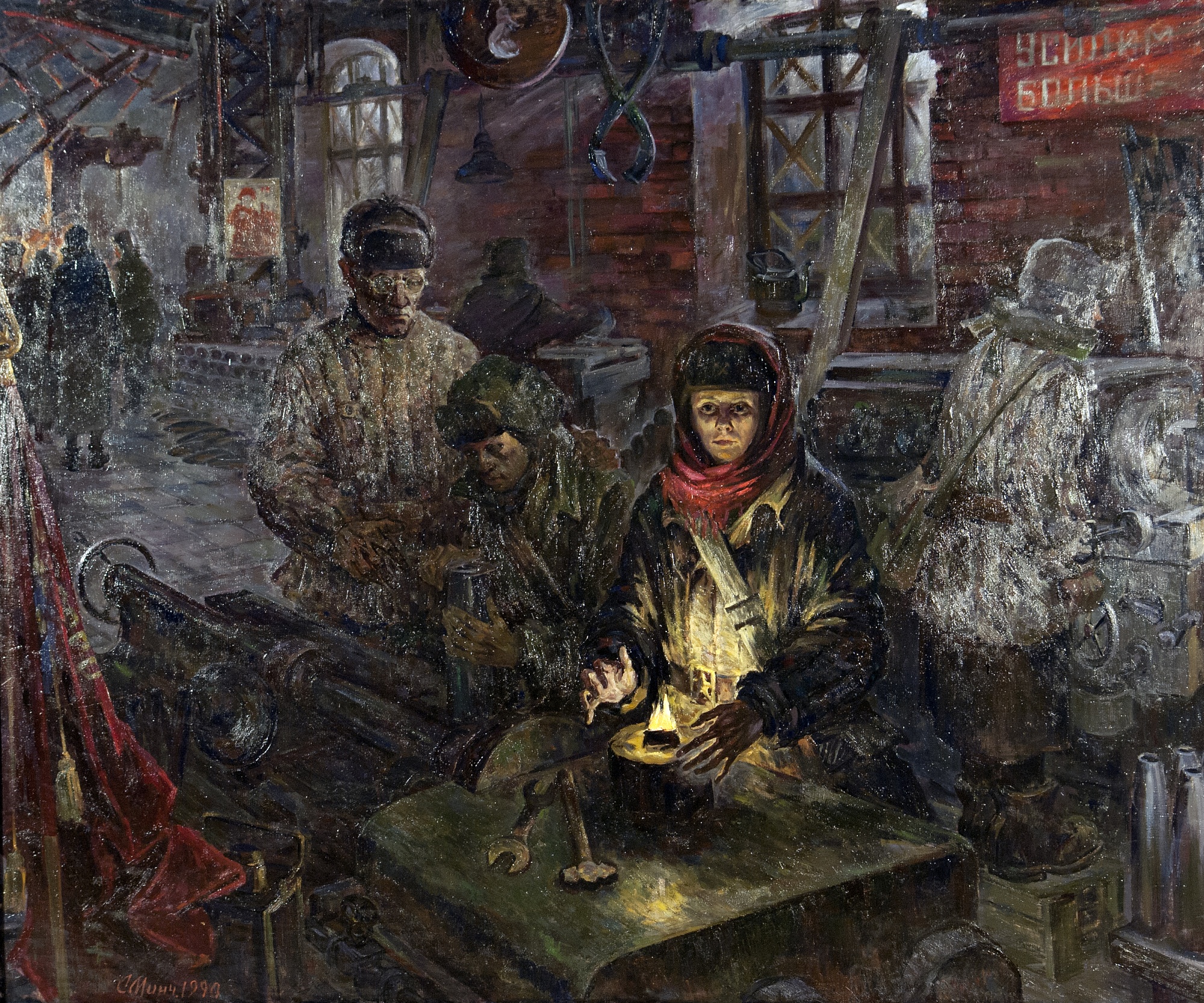 На картине «Солдаты тыла» хорошо выписан заводской цех. На переднем плане мы видим станки, группу рабочих, занятых изготовлением снарядов. Но главным героем здесь стал мальчик, который на мгновение о чем-то задумался. Его лицо освещает блик коптилки. И этот свет теплится, как огонек надежды. А вокруг кипит работа, люди своим самоотверженным трудом приближают победу.