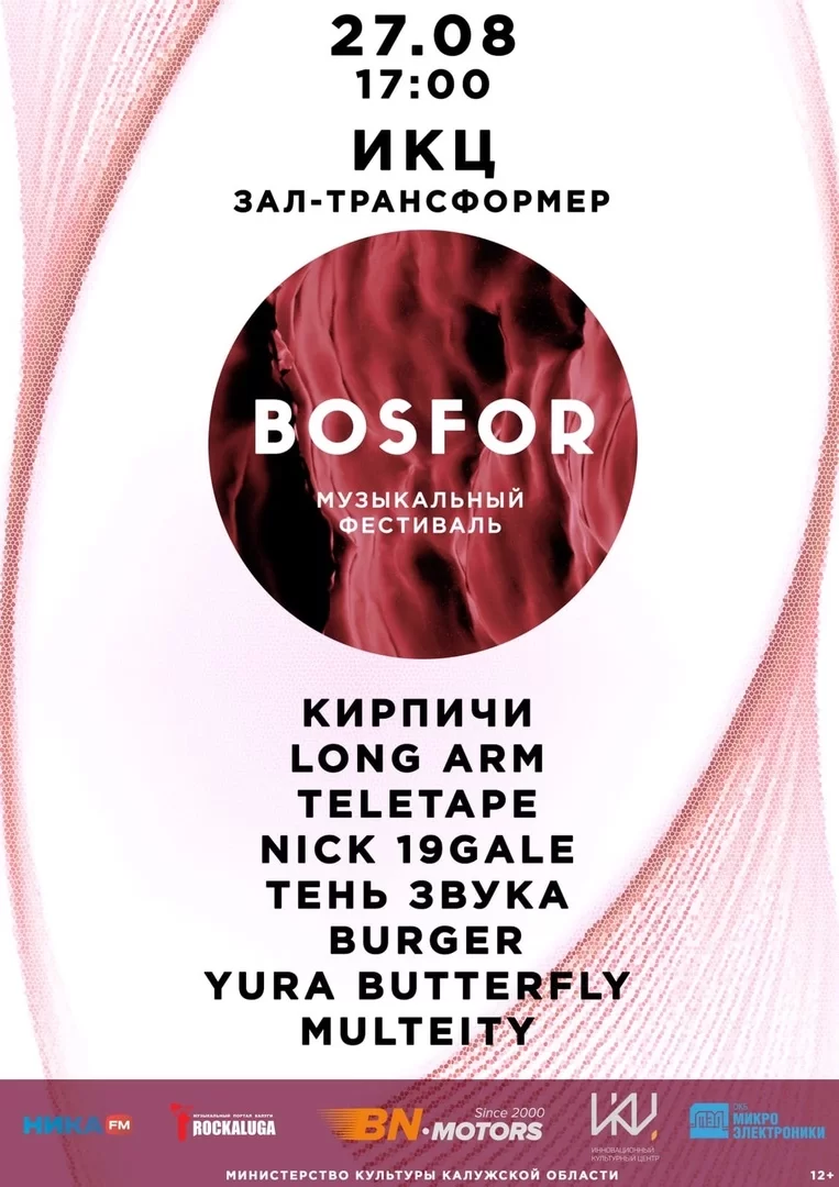 В субботу, 27 августа, в Калуге на площадке ИКЦ пройдет ставший уже традиционным музыкальный фестиваль Bosfor, приуроченный ко Дню города. В соцсетях был опубликован лайнап. Так, хедлайнером фестиваля станет группа из Санкт-Петербурга «Кирпичи».