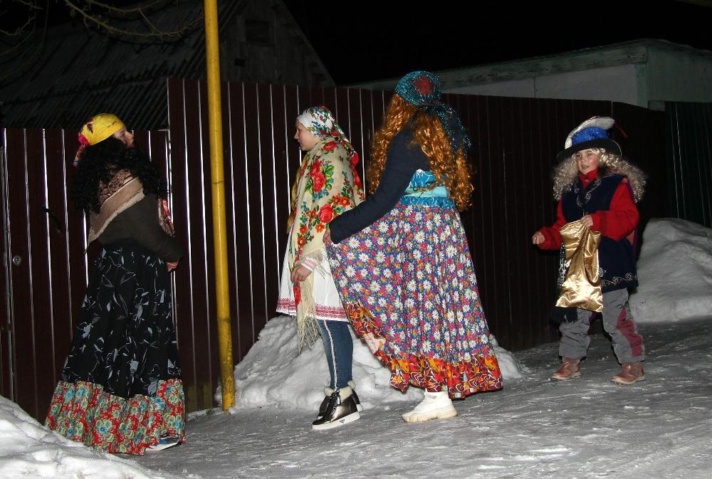 – Да, – вступает в разговор тетушка. – Еще лет десять–двадцать назад и с гармошками по улицам ходили, и в санях с лошадкой ездили. Рядились по-разному, цыганами, например, платки обязательно, шубы выворачивали… В дома заходили, пели «Коляда пришла, отворяйте ворота»... Обязательно зерном посыпали в доме. «Сею-сею, посеваю, с Рождеством вас поздравляю…» Никто не обижался, что мусорили, наоборот, маленьким ребятам конфеты давали, компаниям постарше – денежки на пиво… Вон в клубе же дети собираются, – вдруг вспоминает собеседница.