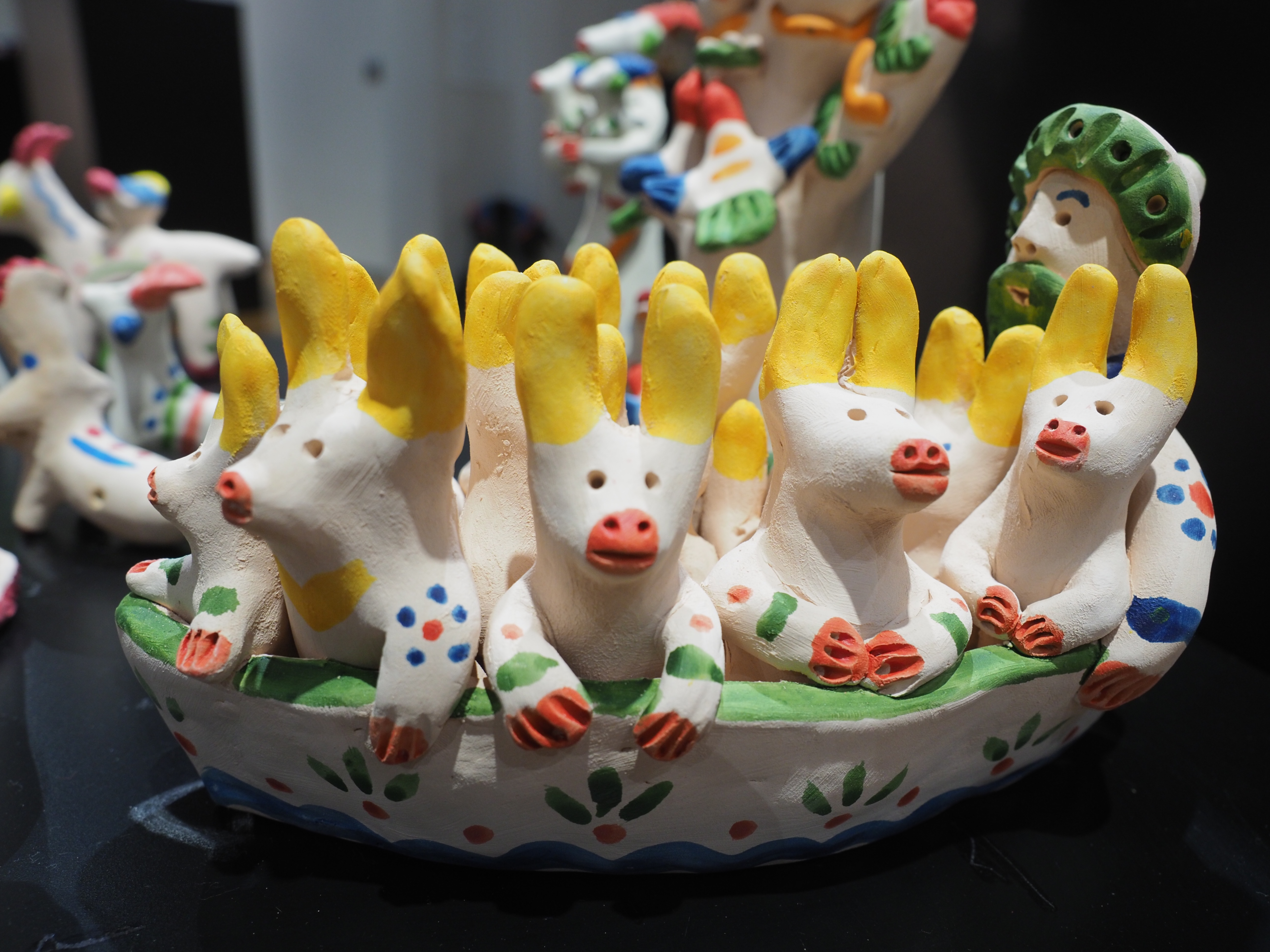 И все-таки выставка глиняной игрушки – это прежде всего детство и сказка. Теплая, душевная глина создана для игрушек и домашней утвари. Она хранит энергию рук, сотворивших из нее нечто и потом прикасающихся к ней, служит оберегом. Не случайно к керамике, лепке тянутся и дети, и взрослые, и занятие это, как говорится, всем возрастам покорно. И знаете, какую удивительную странность я заметила? Почти невозможно, глядя на многочисленных коников, козлов, коров, сказать, лепил их ребенок или взрослый. Это особенность народной игрушки, наверное, когда ее лепили не художники, а простые люди без специального образования. И это выглядит мило и очень подкупает.