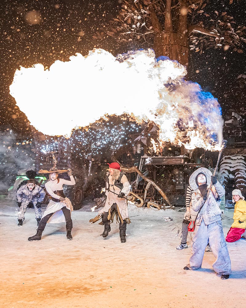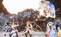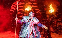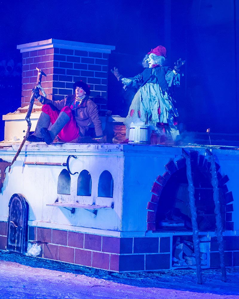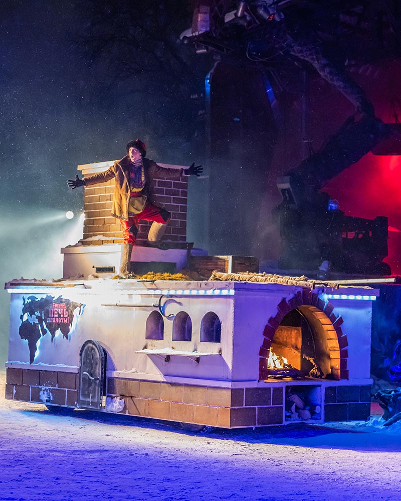 Есть и народ русский, который, если дело делает, то добротно, со старанием, а уж если гуляет, то со всей широтой души. С песнями и плясками, с… каскадом ярких пиротехнических эффектов. А рядом жарким пламенем пылает печка, «управляемая» Емелей. Это своего рода образ матушки-России. В отечественном фольклоре печь как основа всего, она была и спасительницей, и кормилицей, став самым настоящим символом русской жизни.