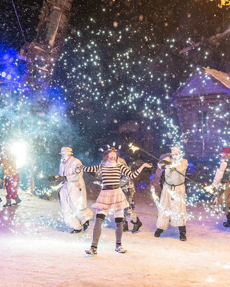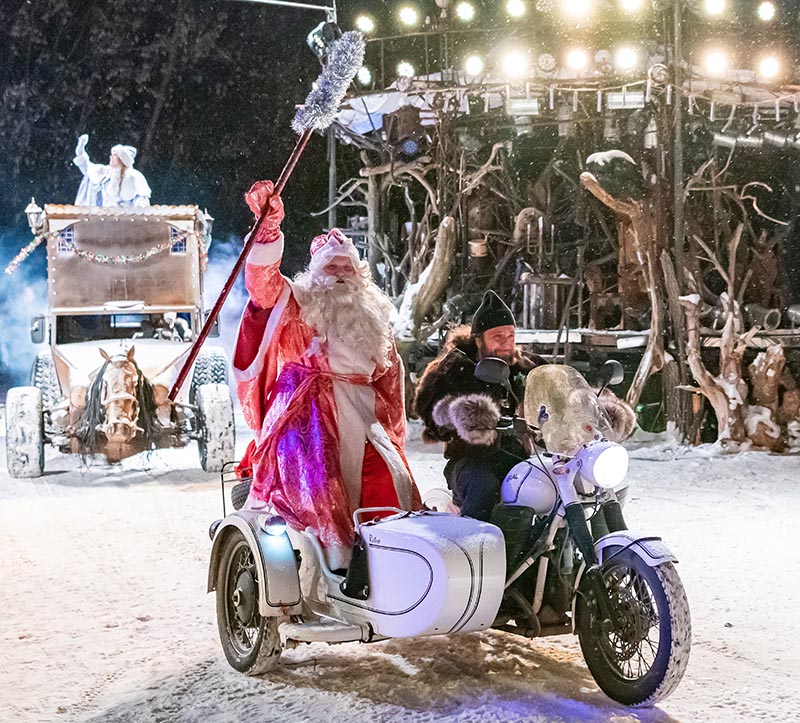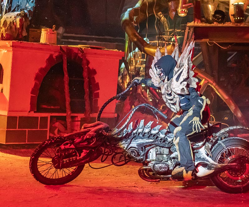 Величественную силу сказки дополняет мотоциклетная тема – это детский праздник с острыми ощущениями! И мечтами о скорости. Да, тут все по-взрослому, «Волки» всегда все делают с размахом! «Шар смелости» - уникальный по сложности номер мотокаскадеров. Три мотоциклиста на огромной скорости бесстрашно «катали» по кругу, синхронно меняя траекторию. Для того, чтобы все прошло успешно, требуется немалое мастерство! Дали жару и отважные спортсмены, штурмовавшие на мотоциклах припорошенный снегом трамплин. Они показывали трюки, от которых захватывало дух. Кажется, и этот номер заставлял зрителей замирать от восторга.