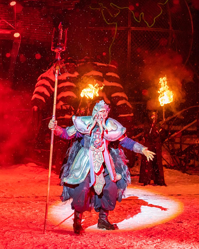 Королева сил Зла – Русалка и ее подручные Змея, Дракон и Таракан чем-то новым на этой территории не стали, но в этот раз они получились еще более фактурные – удивительные и пугающие. Понятно, что это образ Зла, стремящегося захватить все вокруг, символический. Но ситуация в мире остается очень хрупкой, как известно, западные государства практически во все времена стремились на Восток. И все ближе подбираются они к нашим границам… Над байк-центром пронеслись обдающие холодом звуки – смех заокеанской нечисти, которую, кстати, представлял и житель дна – обитатель морских глубин. Этот монстр – новый сказочный персонаж, и выглядит он довольно жутко, под стать всей злой силе: