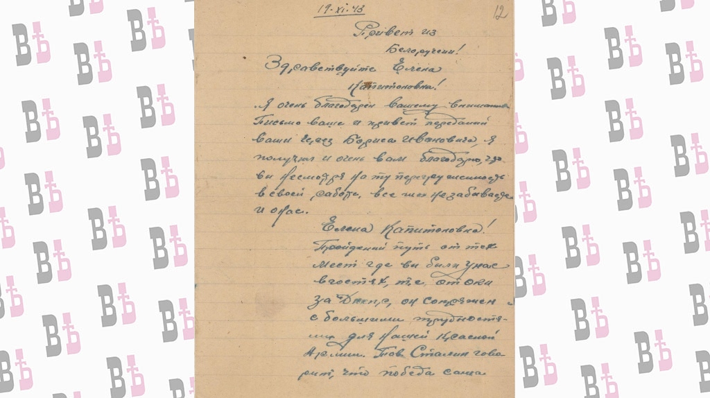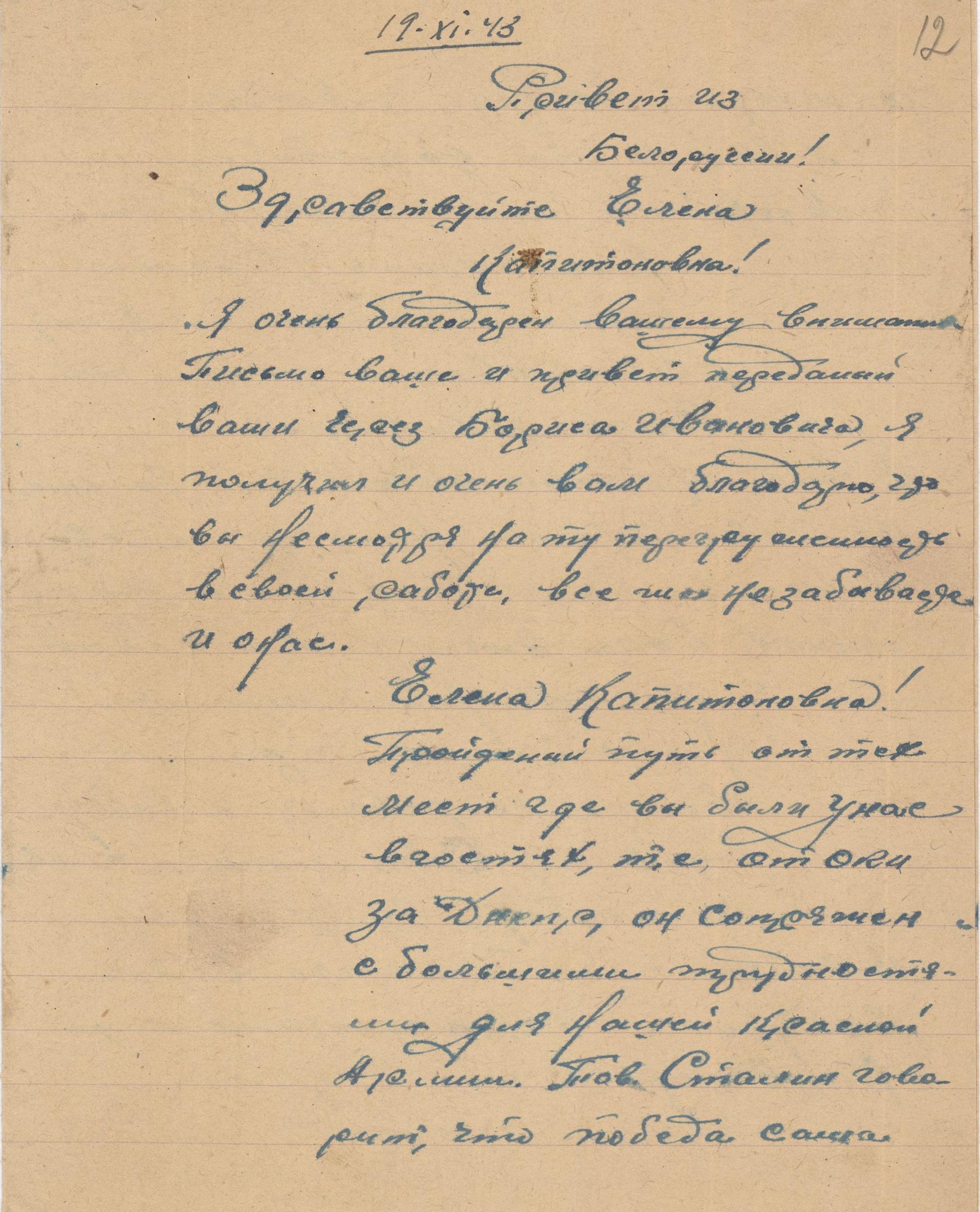 Елена Капитоновна! Пройденный путь от тех мест, где вы были у нас в гостях, т.е. от Оки за Днепр, он сопряжен с большими трудностями для нашей Красной армии. Тов. Сталин говорит, что победа сама не приходит, ее надо завоевать. И вот на нашу долю выпало завоевание этой победы. Но вы можете быть уверены в этом, что Красная армия с поставленной задачей тов. Сталиным справится.