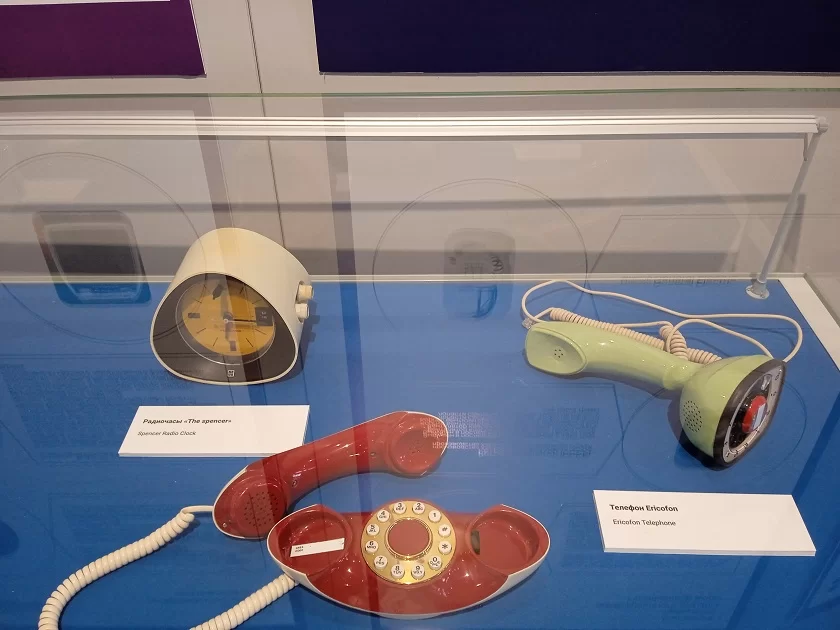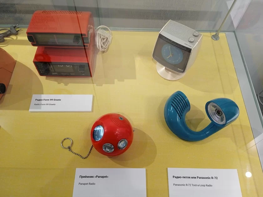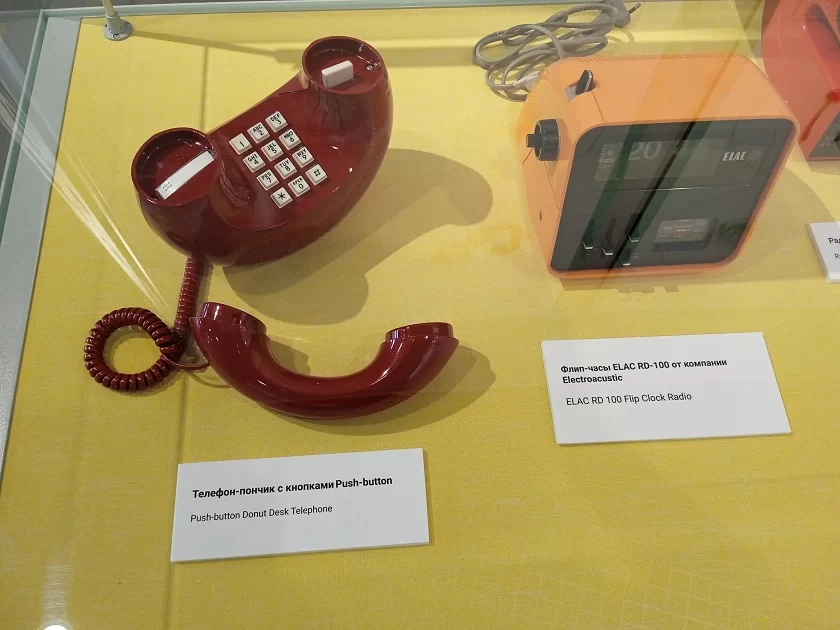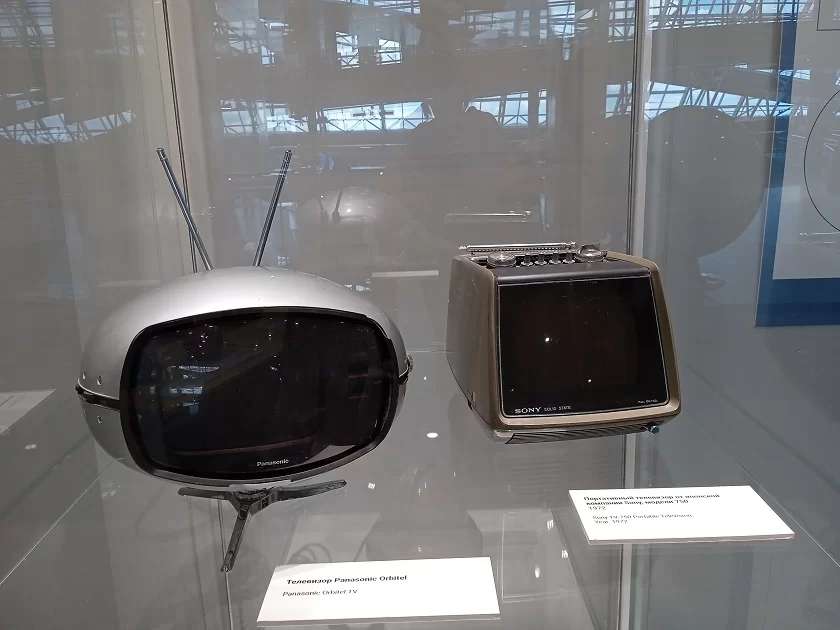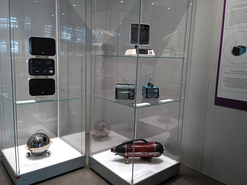 Информационные стенды рассказывают о технических новинках своего времени, которые выпускались в массовое производство.
